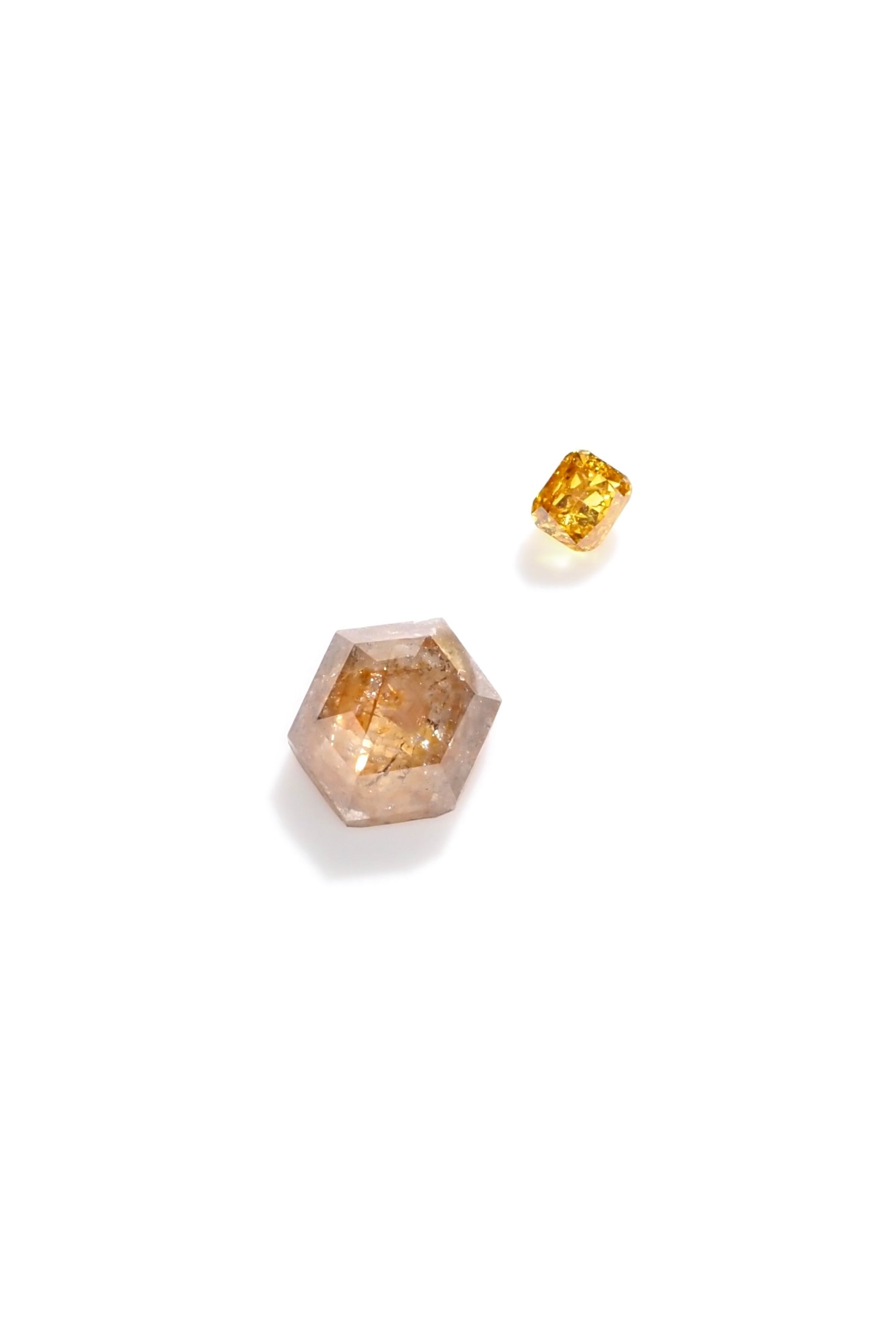 偶然出会った、天然ありのままの美しい甘色のキャンディカラーを持ち、イエローとオレンジレッドが芳醇なフルーティーのような作品性に仕上がっている希少なカラーダイヤモンドたち2石との出会い。 美しいビビッドな輝きのファセットカットと、アンティークで趣のあるヘキサゴンローズカットによって異なるカットの輝きを贅沢に味わえます。