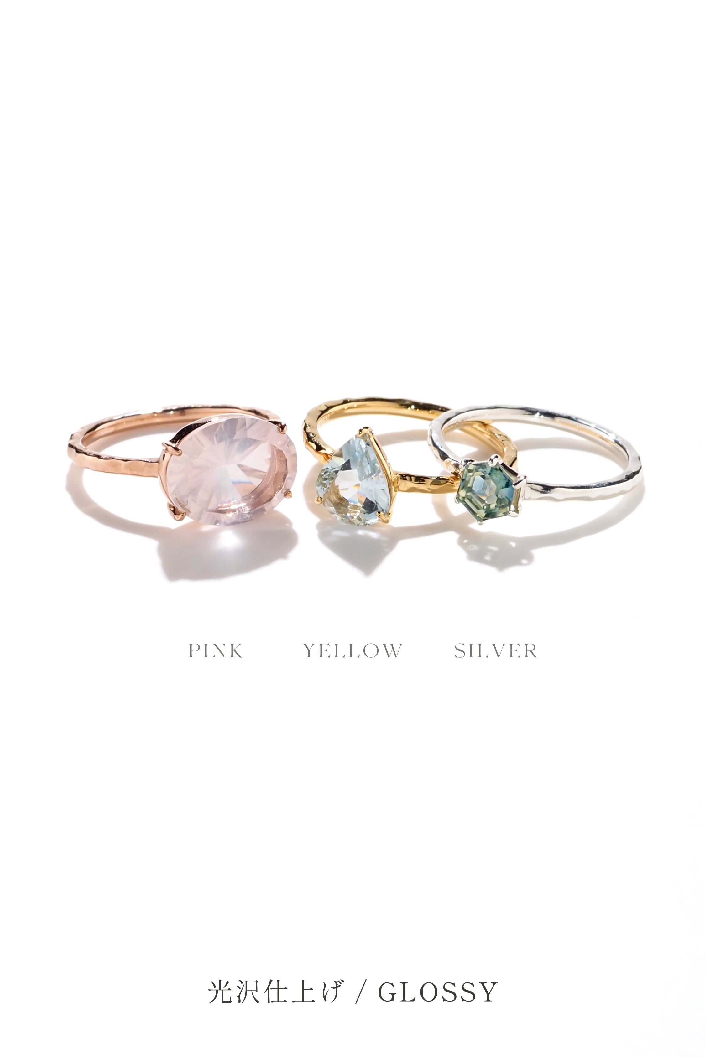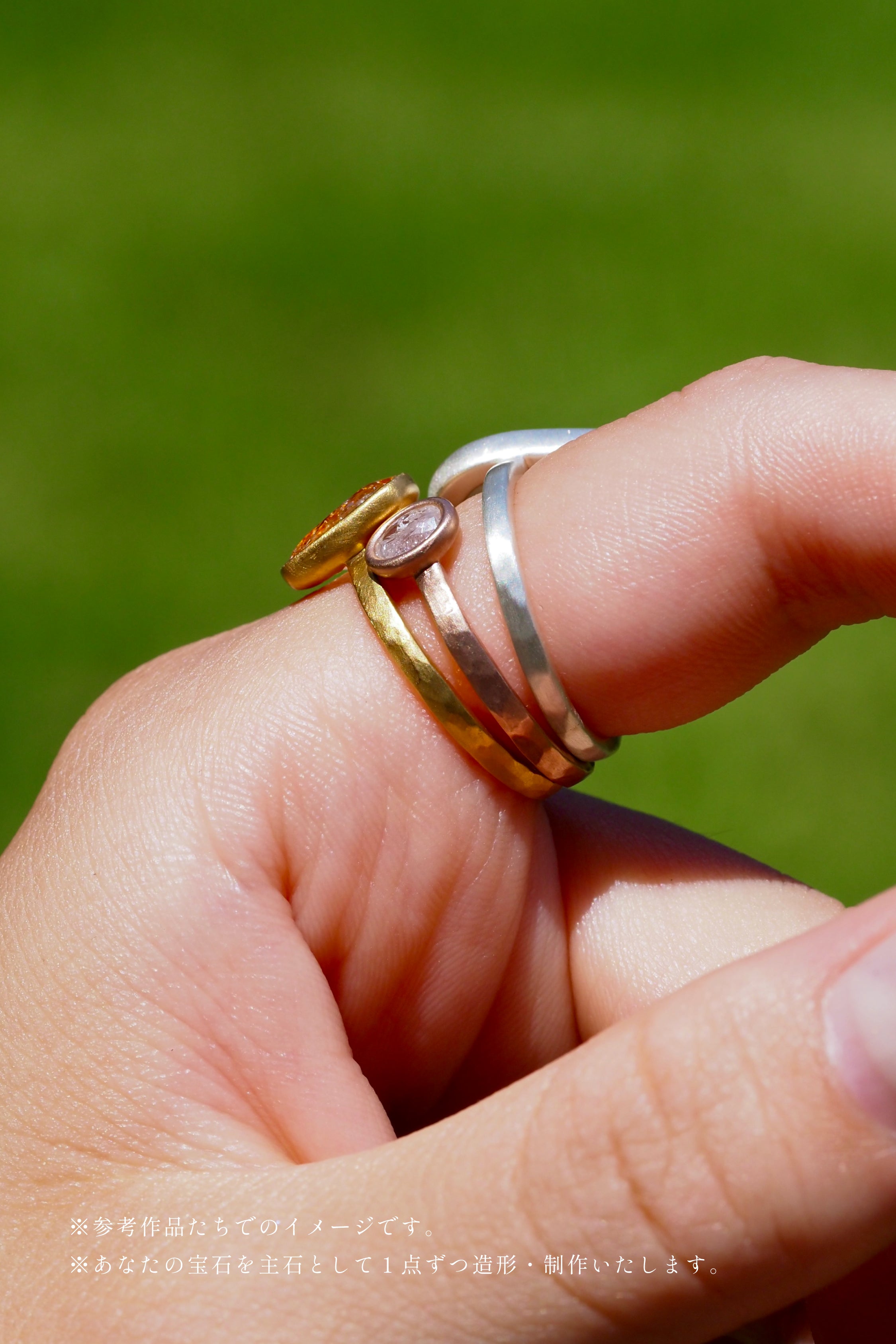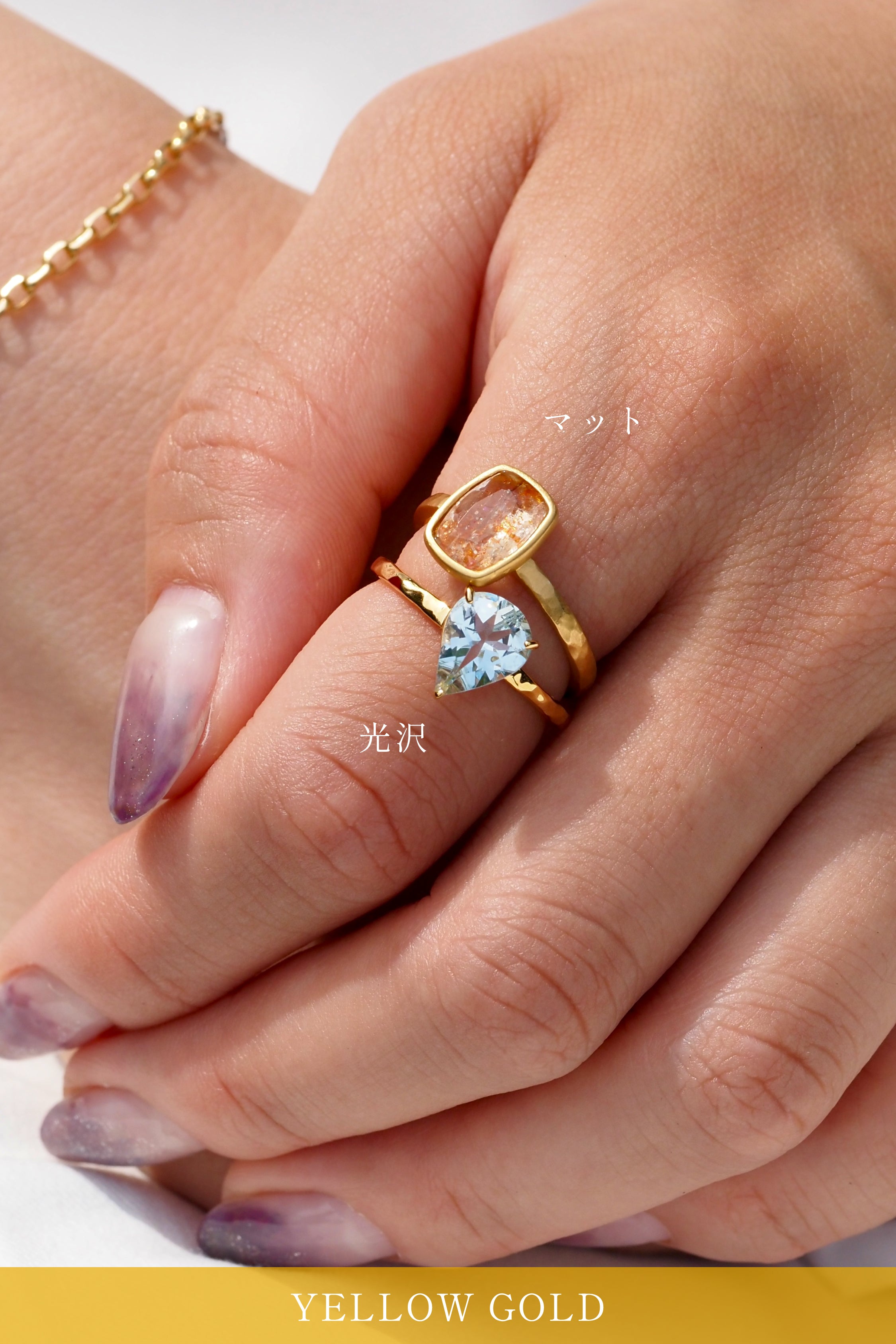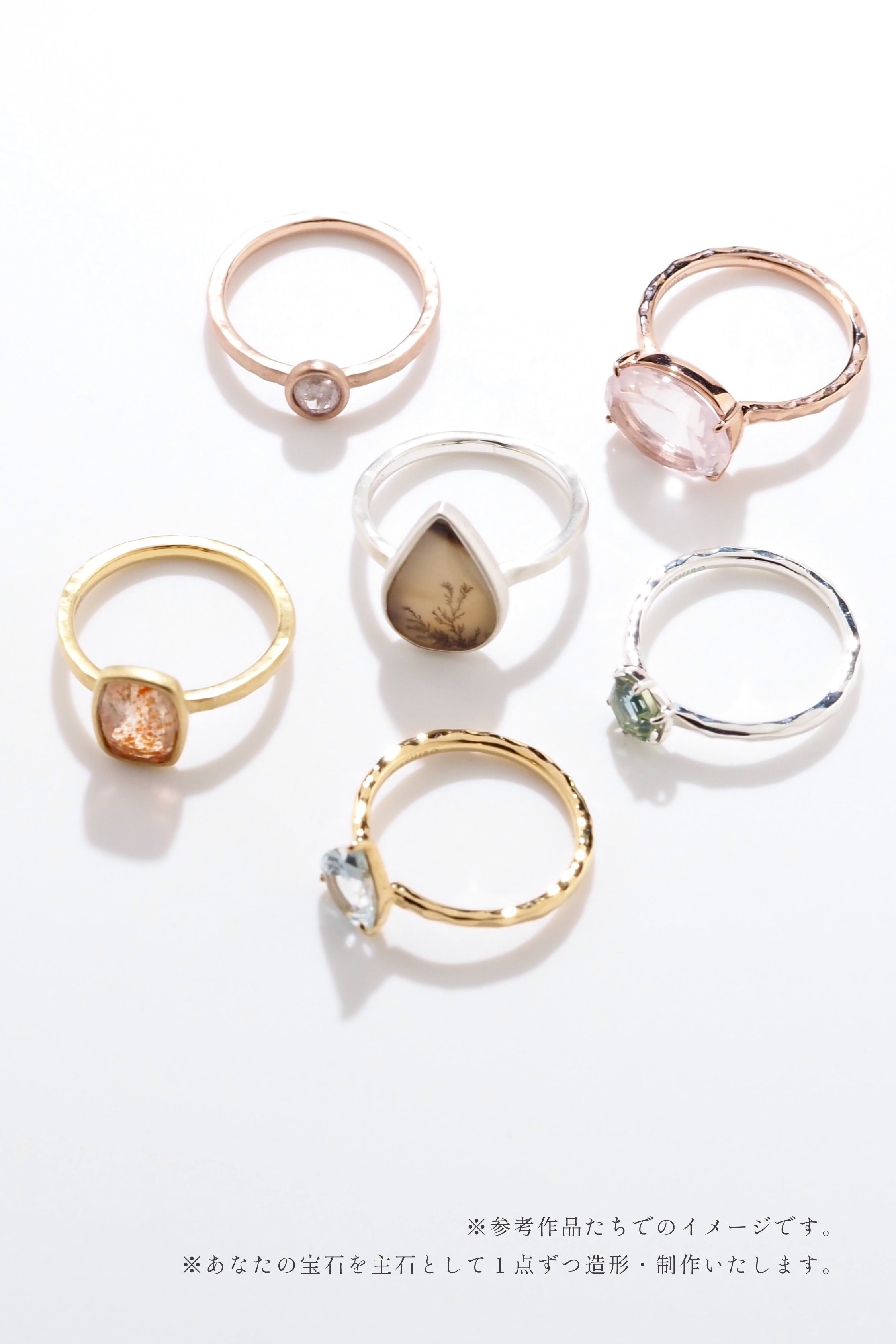 宝石のセット方法や向きはもちろん、貴金属のカラー〜表面加工に至るまで、自由なカスタマイズで世界に1つの槌目加工リングを仕立てます。 アーム幅も1.5mmと槌目加工のテクスチャを存分に味わいながらも極限まで華奢に造形しており、他のポットリングやシンプルな華奢リングと重ね付けなどのアレンジもお楽しみいただけます。