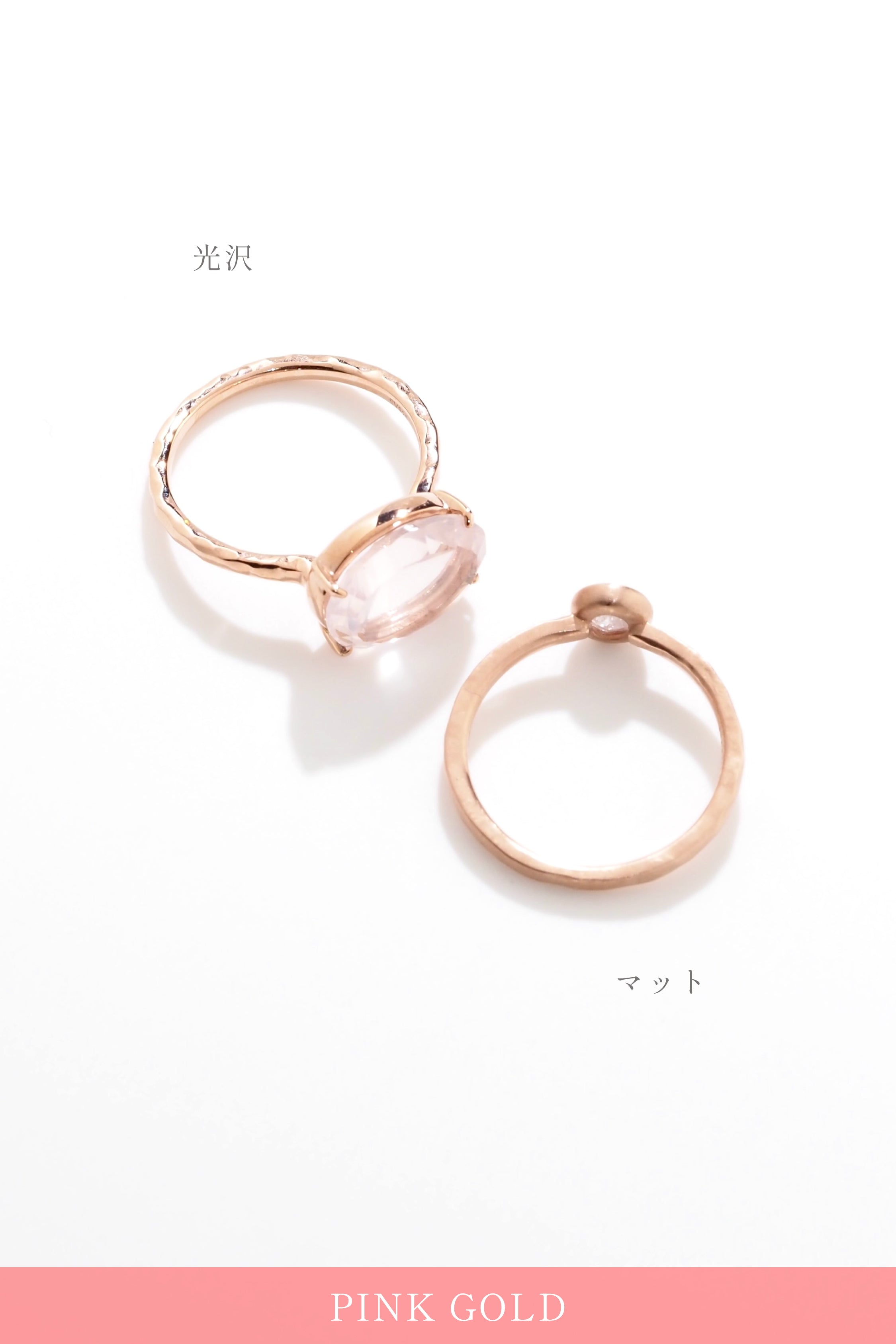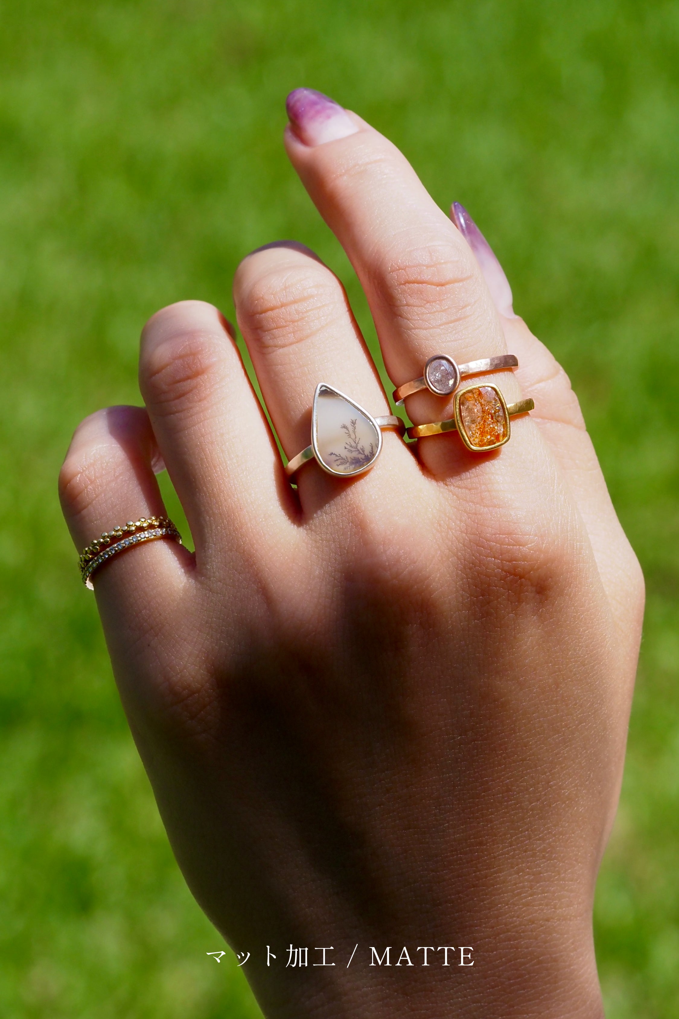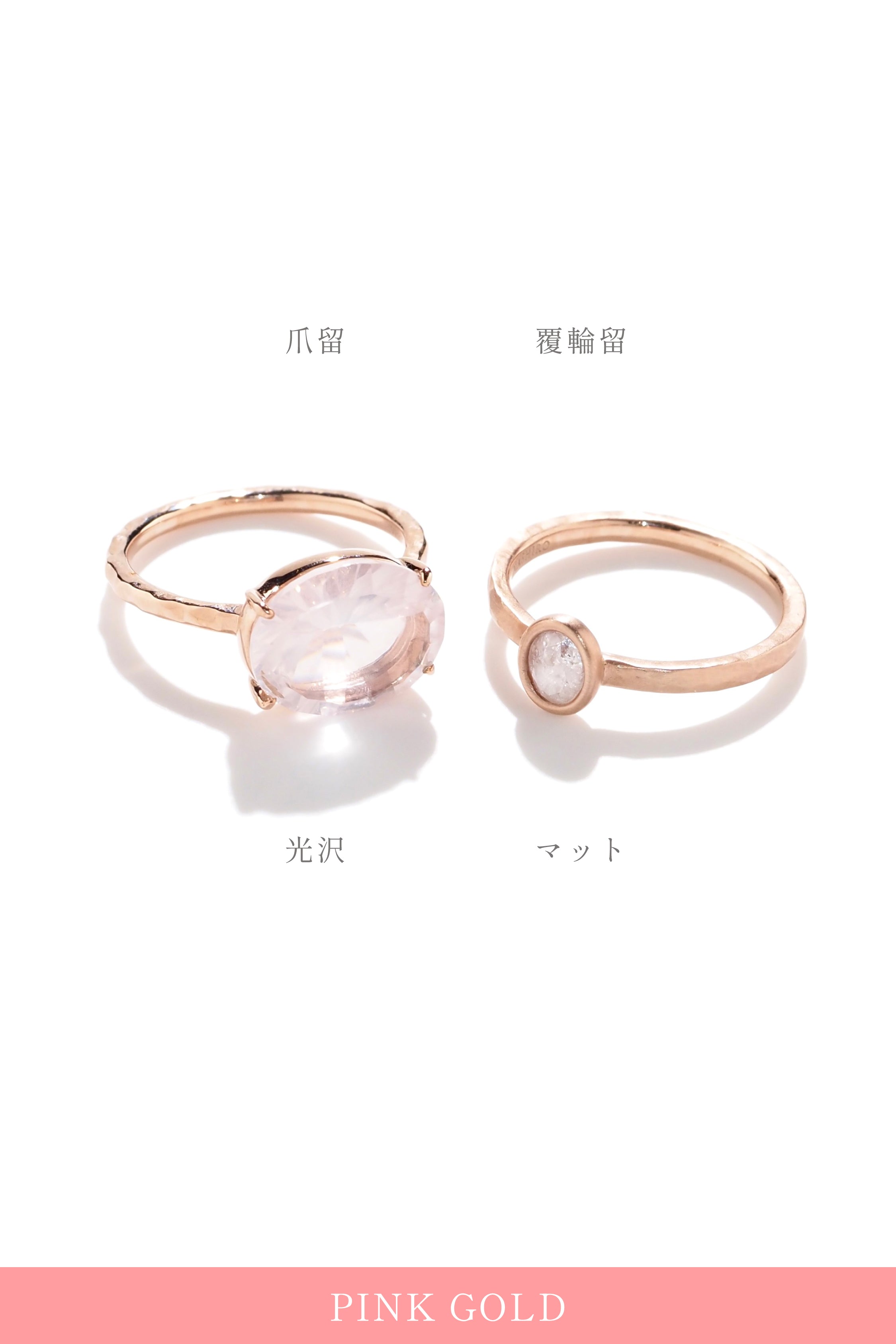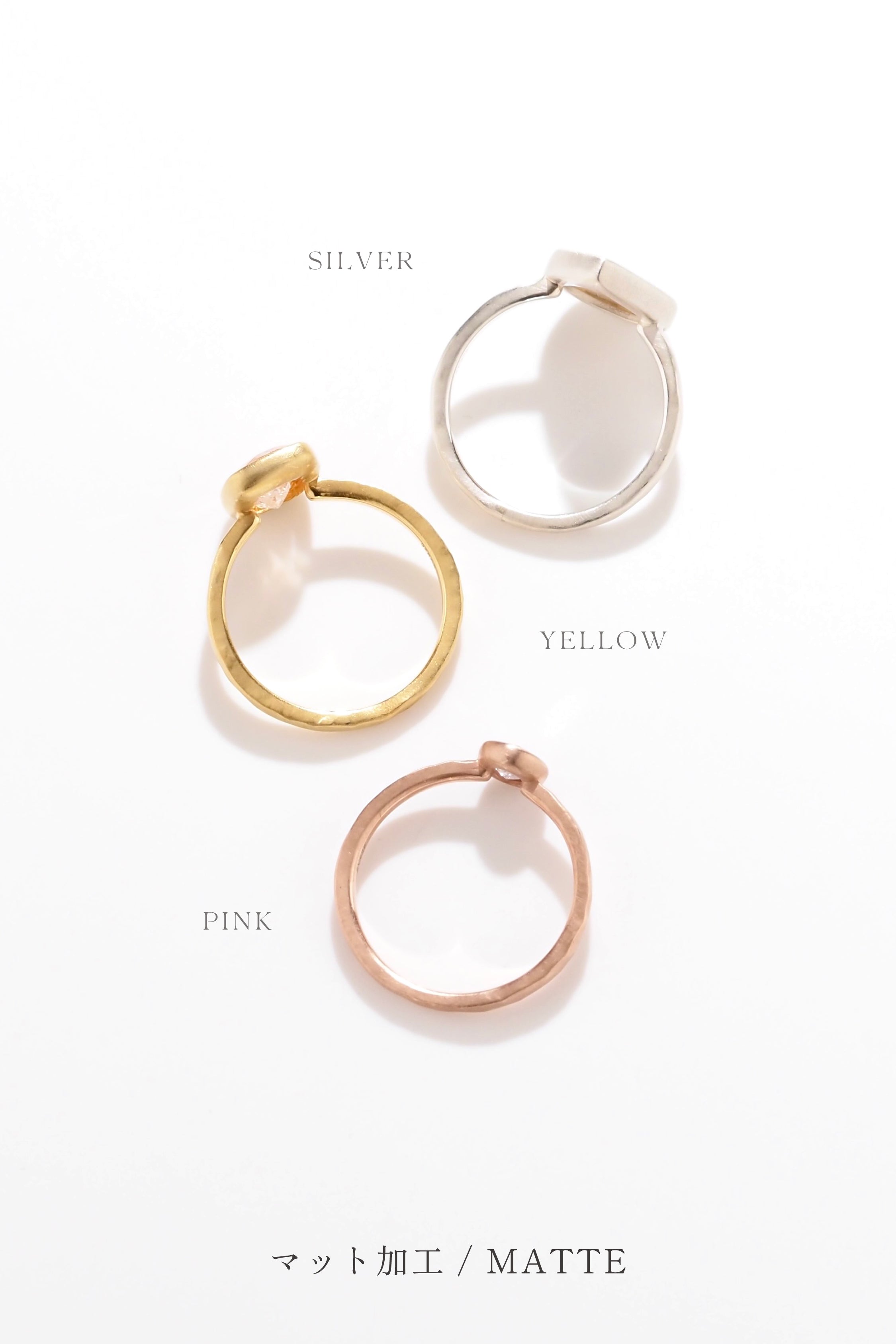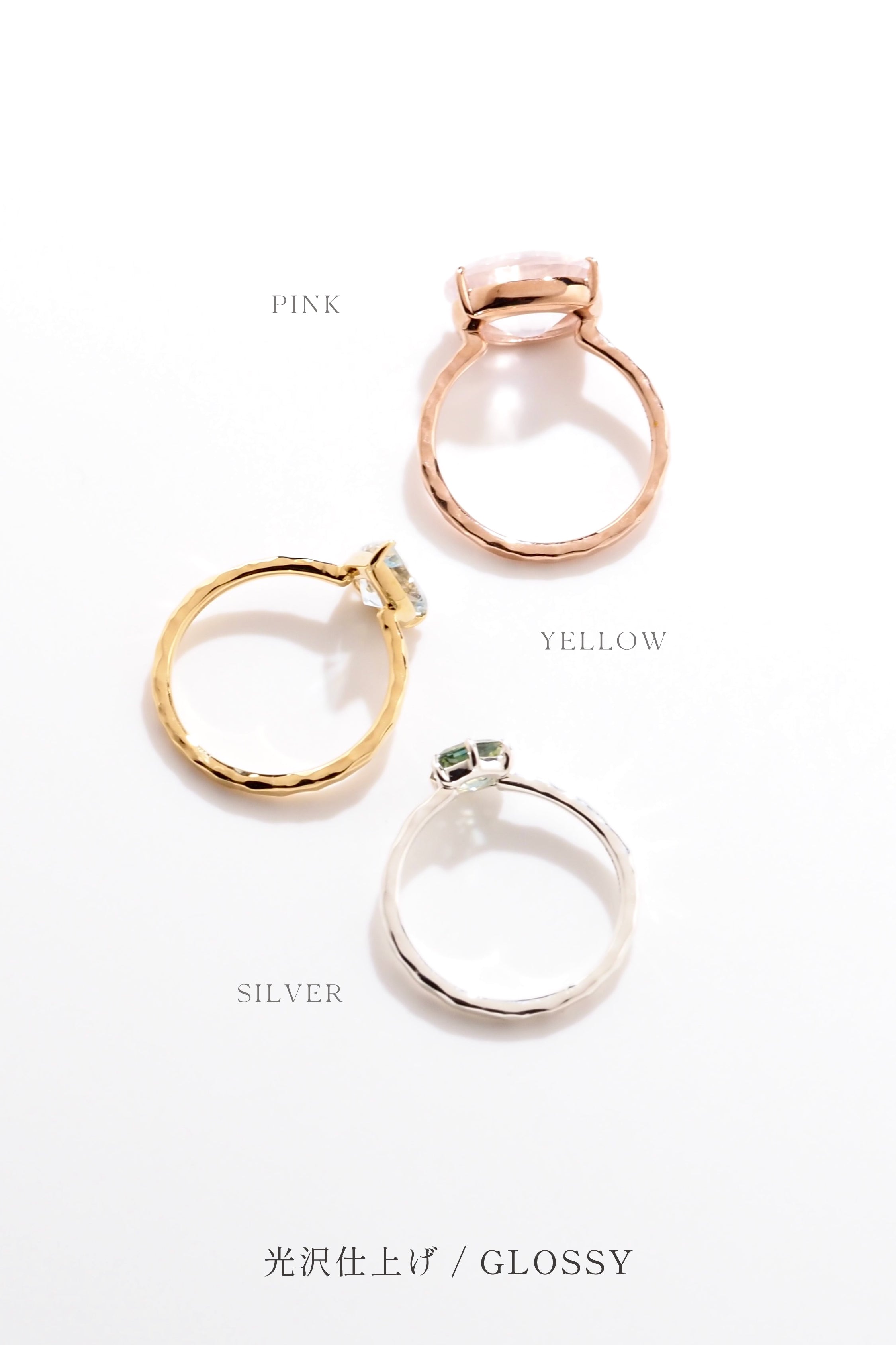 宝石のセット方法や向きはもちろん、貴金属のカラー〜表面加工に至るまで、自由なカスタマイズで世界に1つの槌目加工リングを仕立てます。 アーム幅も1.5mmと槌目加工のテクスチャを存分に味わいながらも極限まで華奢に造形しており、他のポットリングやシンプルな華奢リングと重ね付けなどのアレンジもお楽しみいただけます。
