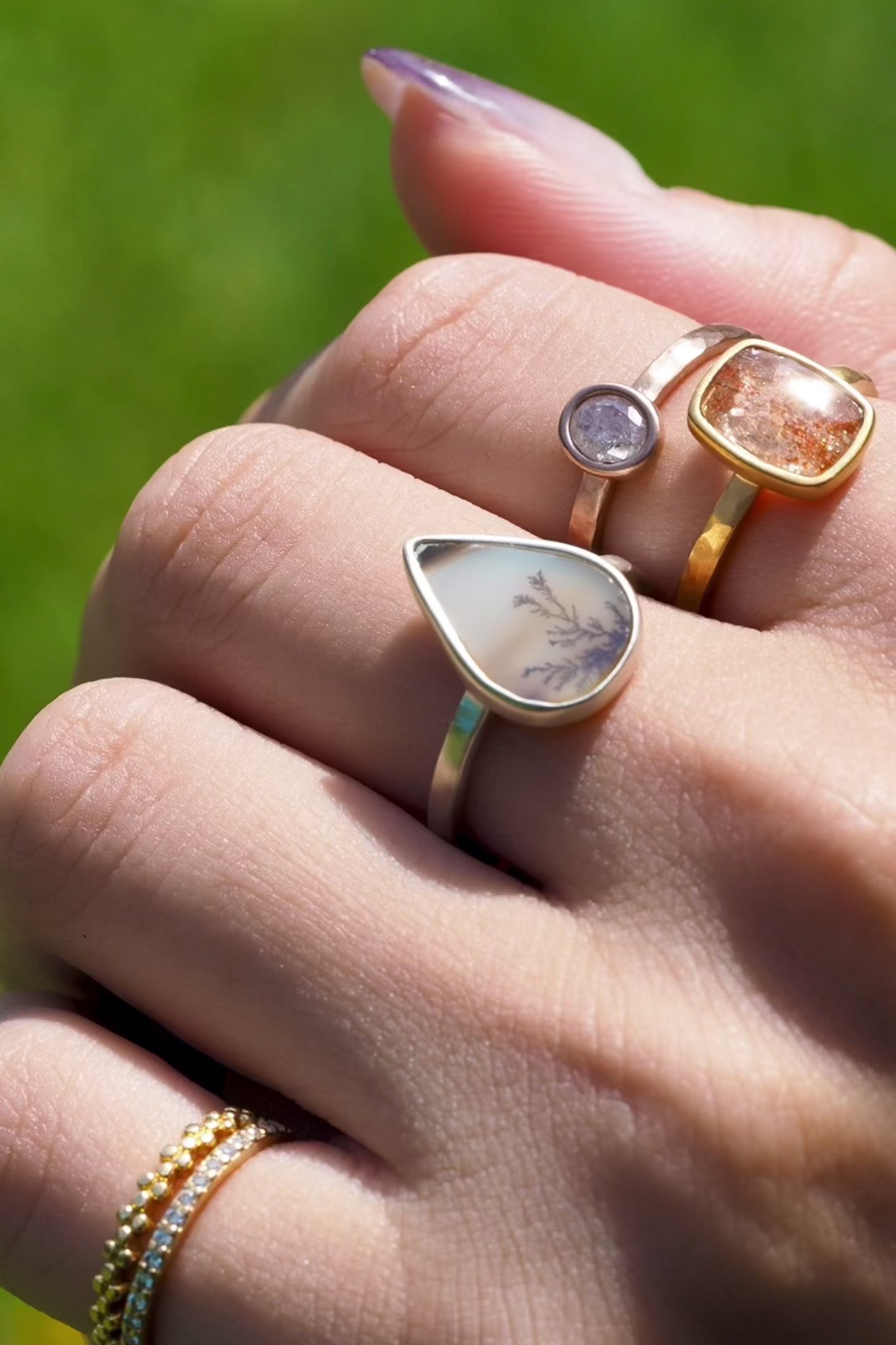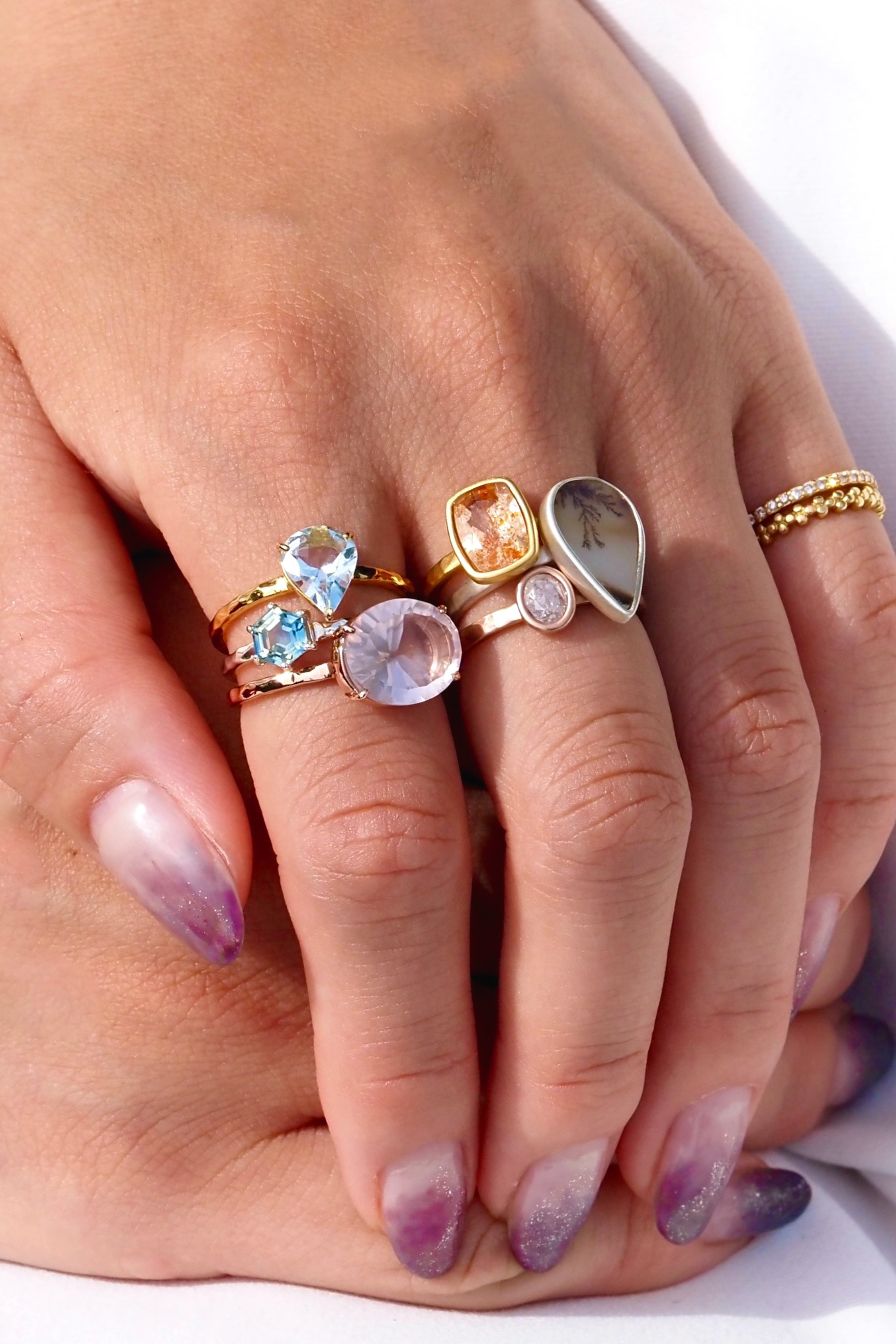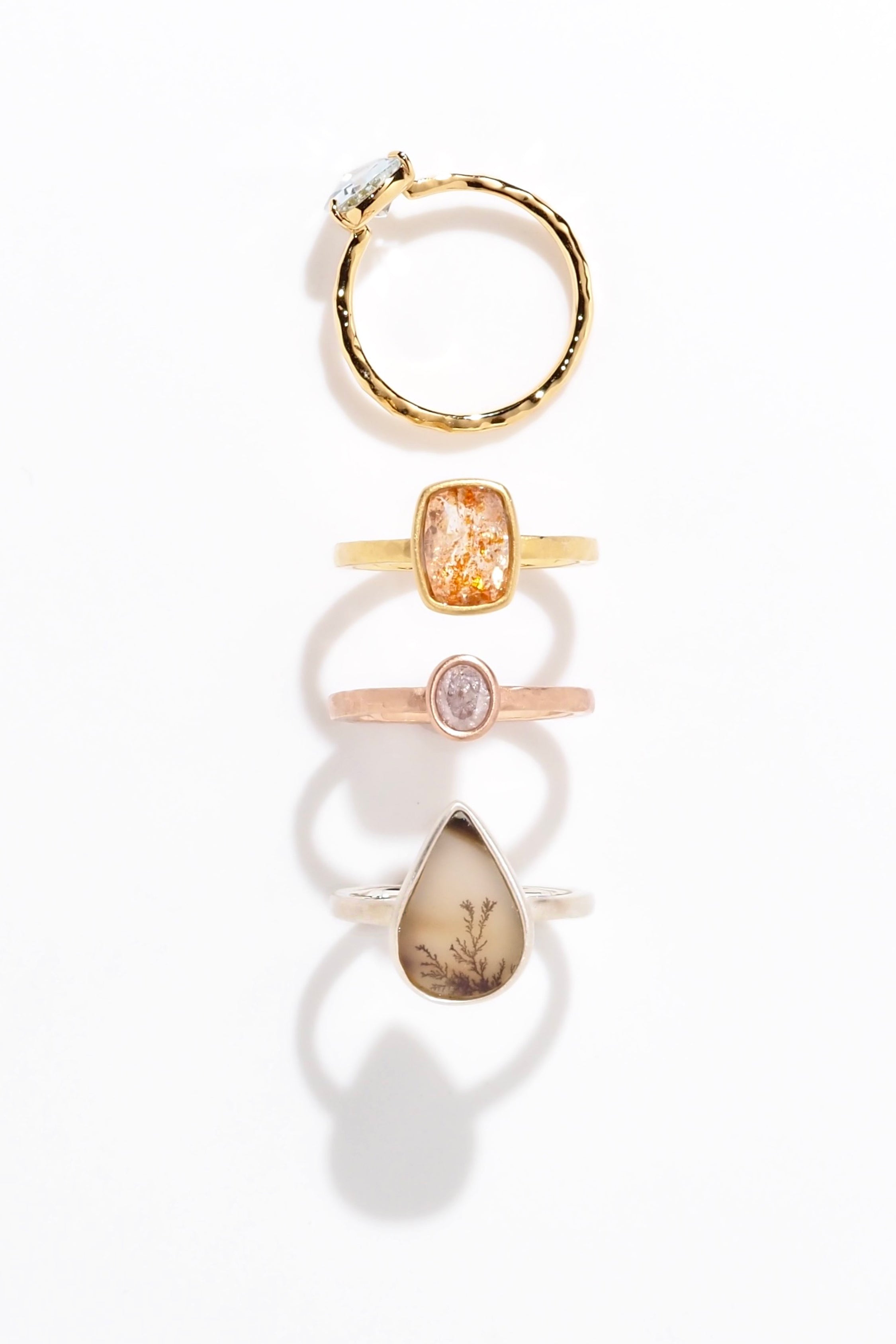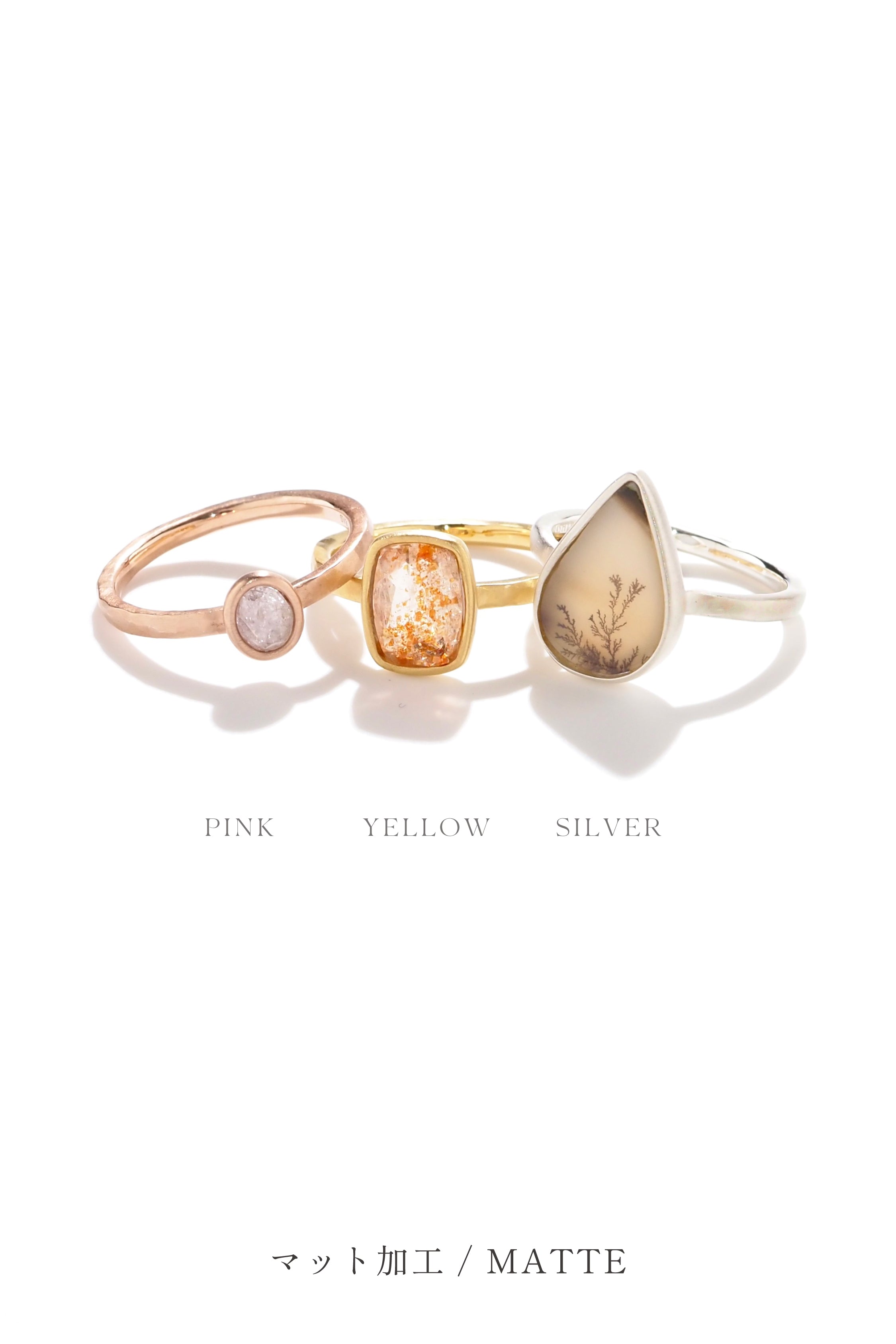 宝石のセット方法や向きはもちろん、貴金属のカラー〜表面加工に至るまで、自由なカスタマイズで世界に1つの槌目加工リングを仕立てます。 アーム幅も1.5mmと槌目加工のテクスチャを存分に味わいながらも極限まで華奢に造形しており、他のポットリングやシンプルな華奢リングと重ね付けなどのアレンジもお楽しみいただけます。