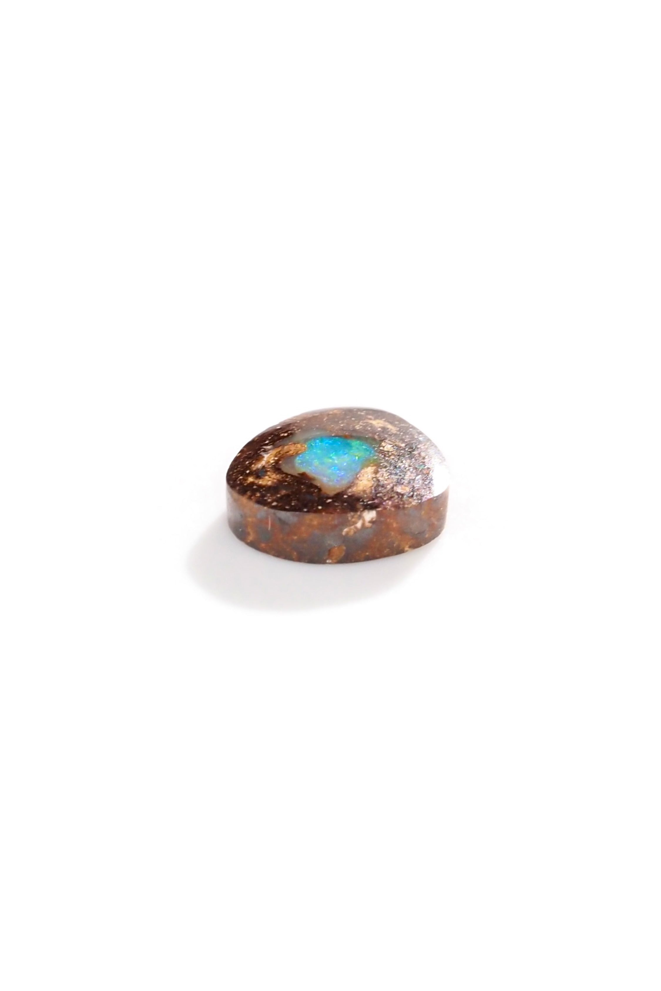 この個体は、深みのあるブラウンの母岩に、まるで“核”のように宿る鮮やかなグリーンブルーの遊色が印象的。