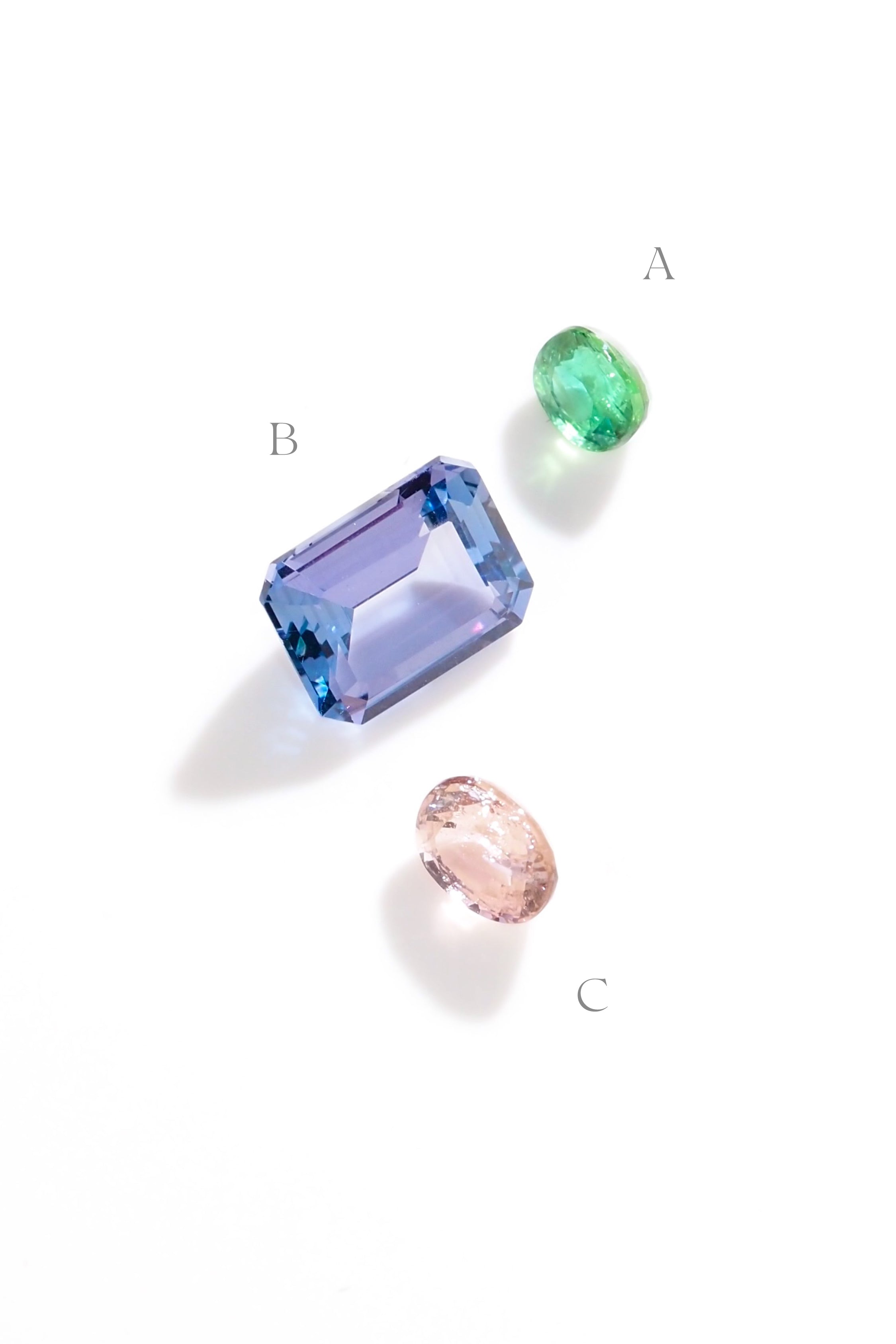 タンザナイトが持つ“多色性”という奇跡。 その可能性を、ここまで明確に、そして美しく体現したセレクションは稀です。 グリーン、ブルー×バイオレット、そして桜色のシェリーカラー。 同じ鉱物、同じ産地でありながら、それぞれがまったく異なる表情と物語を宿す—— 本セレクションは、タンザナイトという宝石の奥深さを一望できる、極めてプレミアムな3石です。 いずれも名産地タンザニア産。 カラー、透明度、サイズ、カット、そのすべてにおいて作品性を感じさせる個体のみを厳選しました。 単石で主役に。 3石を迎えて、色彩のコレクションとして。 どの選択も“正解”となる、特別なミックスセレクションです。