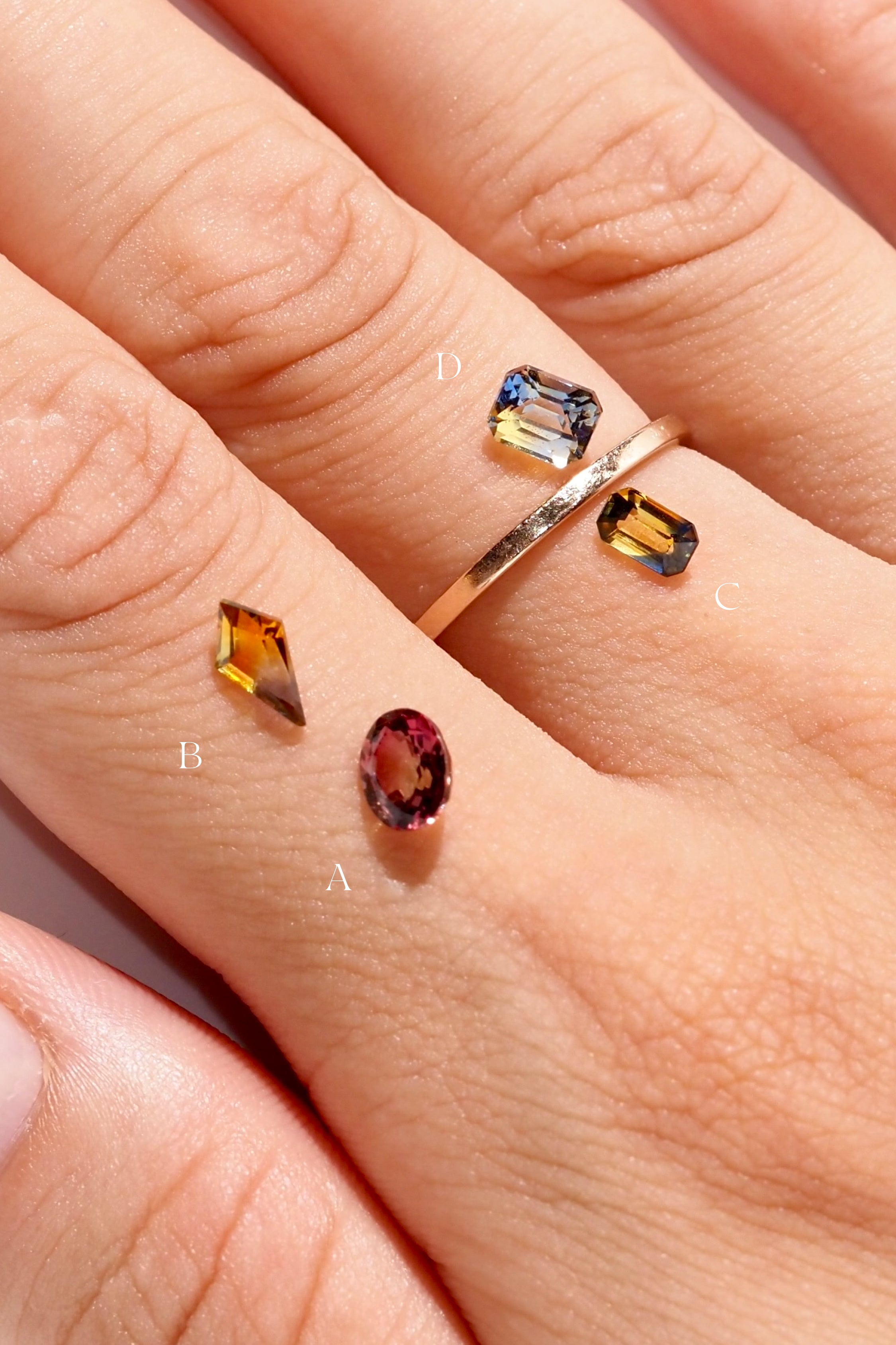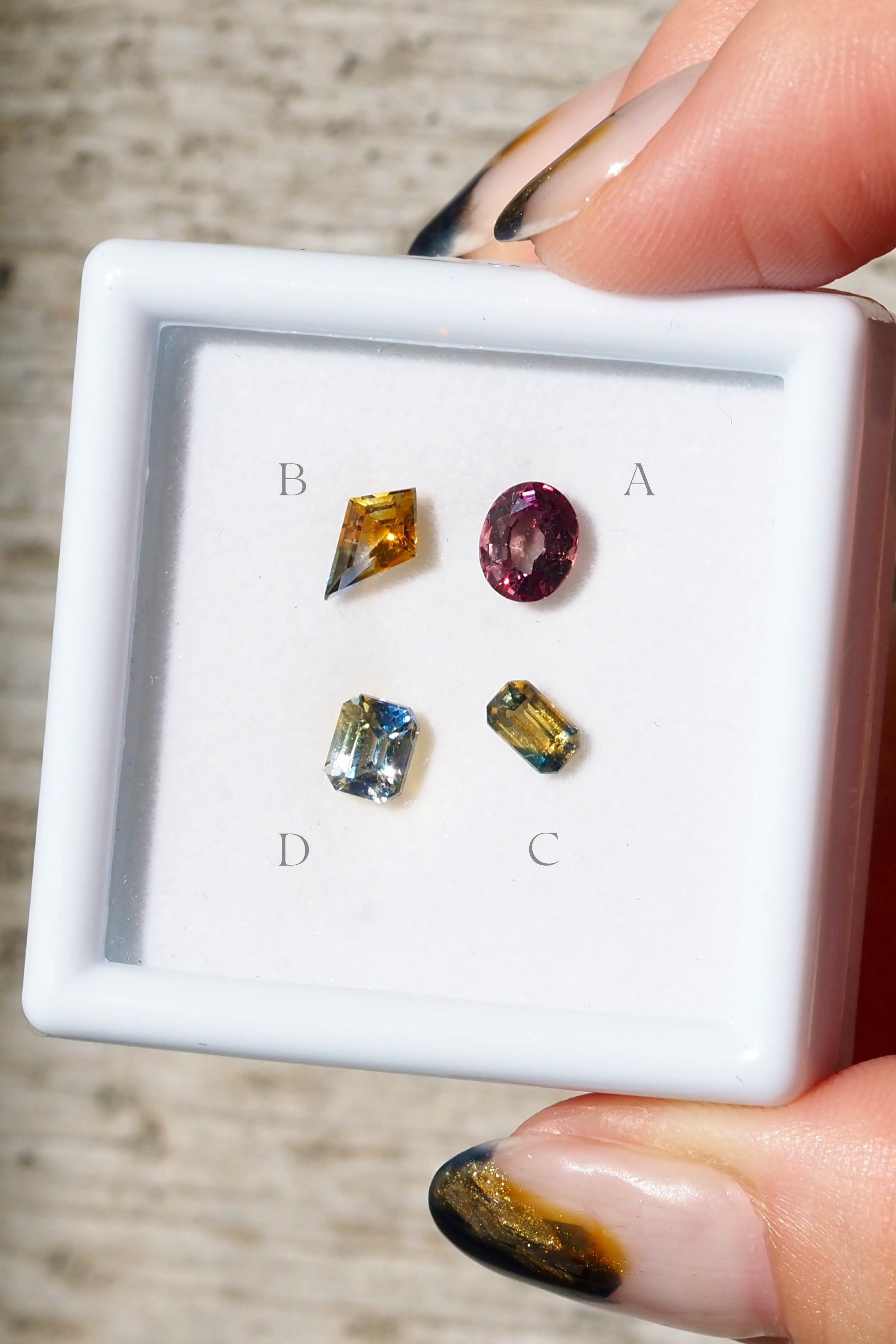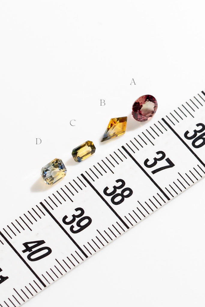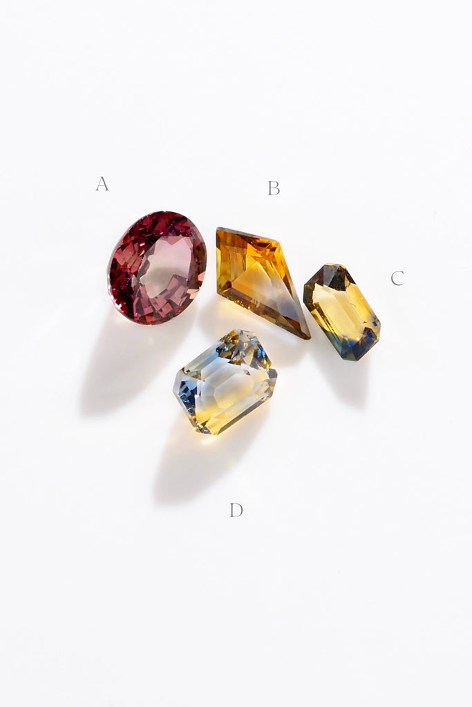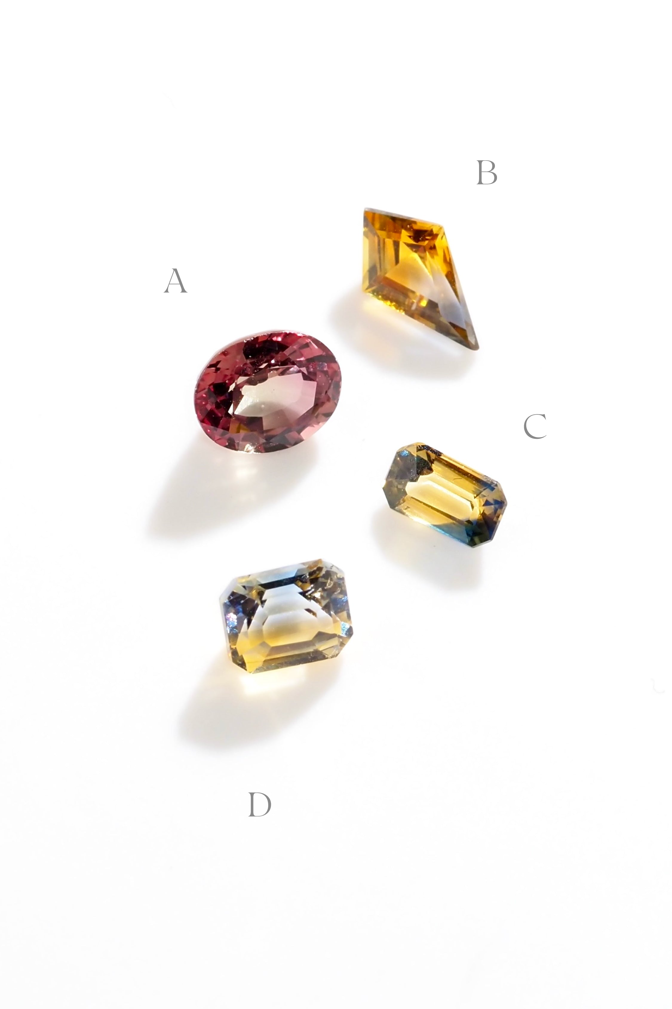 このバイカラーサファイアセレクションは、それぞれが素晴らしい個性のシェイプに研磨されています。 美しくもユニークなそれぞれのカットは、バイカラーを美しく引き立てるだけでなく、素晴らしいジュエリーの主役デザインとして機能してくれます。