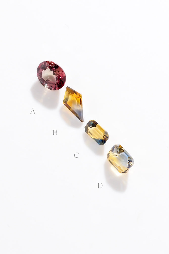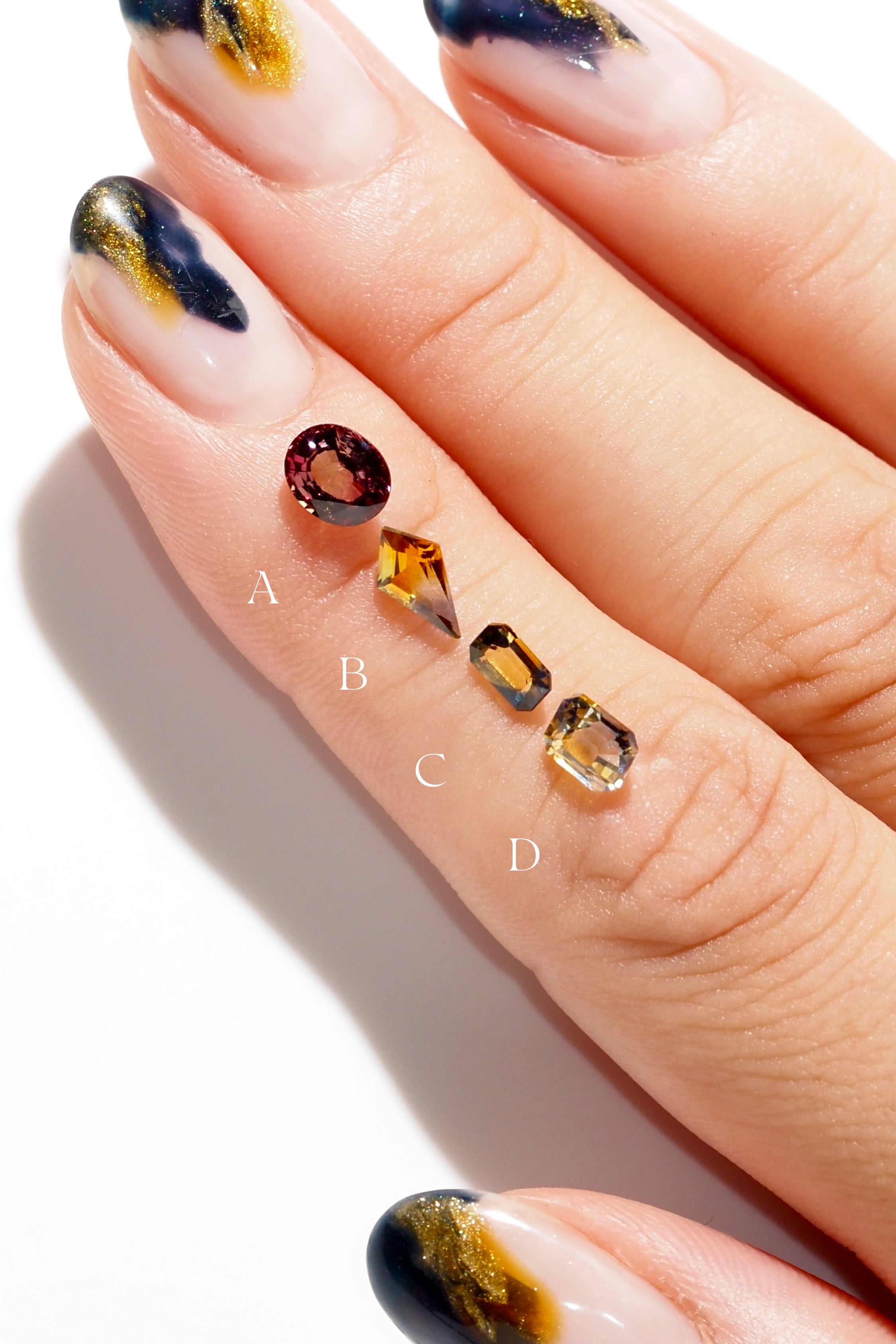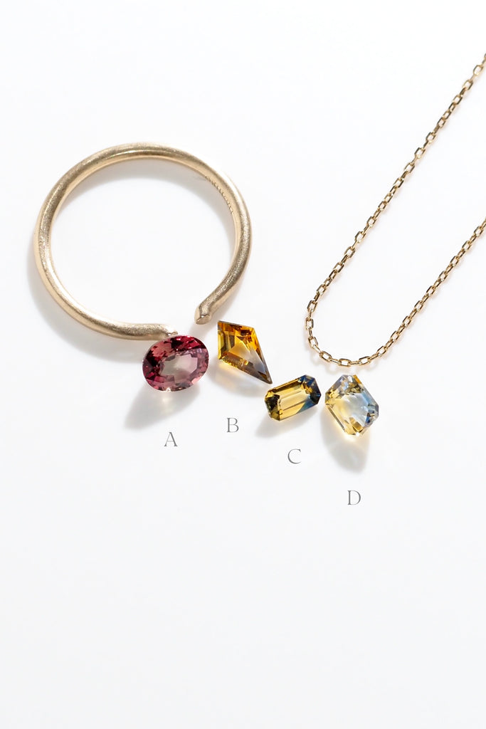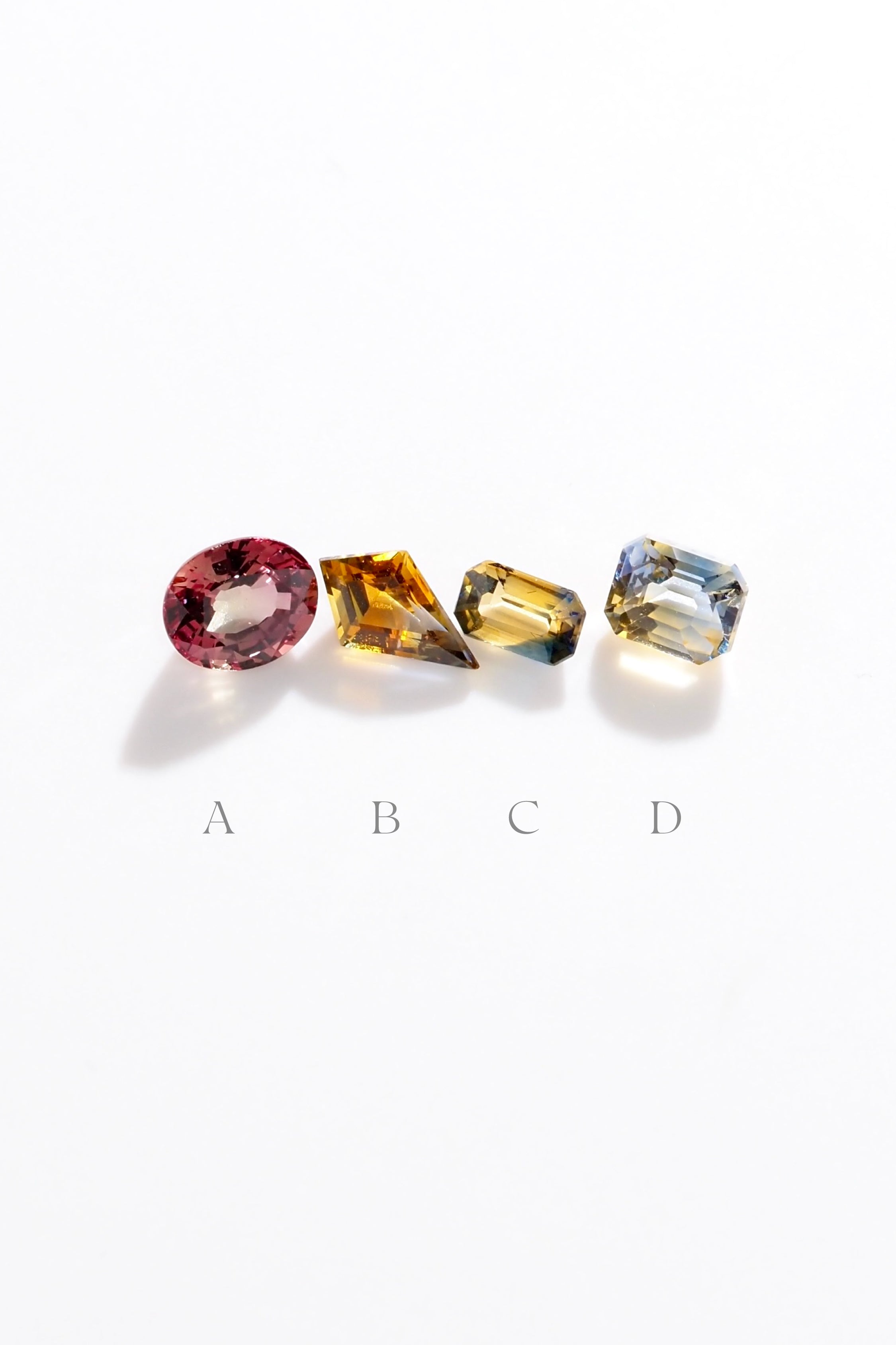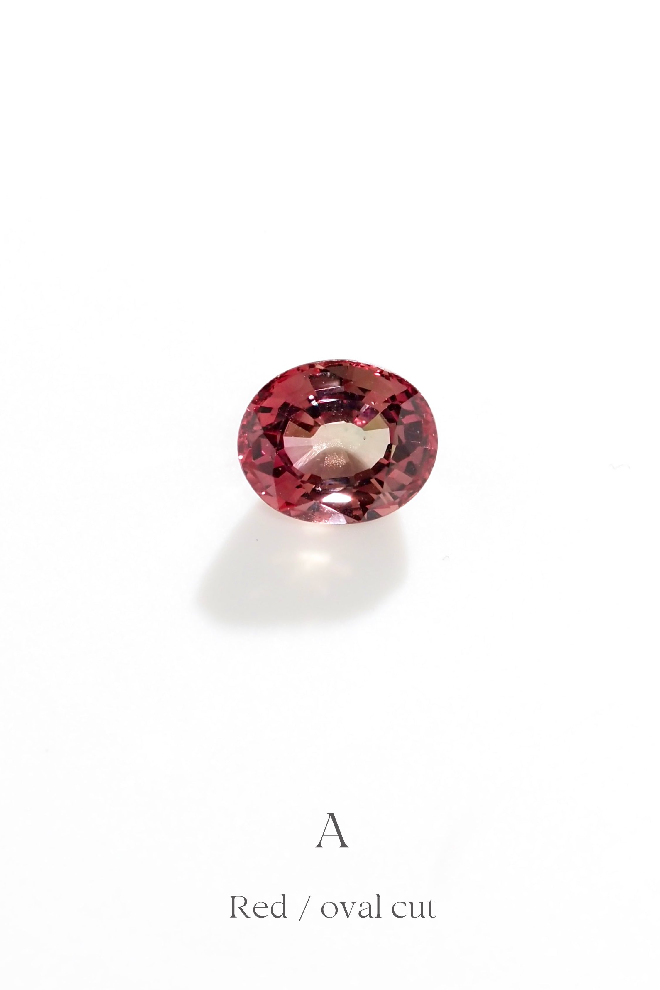 | SIZE / サイズ感 | 「個体A(レッド・オーバル)」約0.89ct / 約5.1*6.1mm「個体B(カイトカット)」約0.43ct / 約7.3*4.3mm「個体C(オクタゴン)」約0.30ct / 約5*3.1mm「個体D(オクタゴン)」約0.69ct / 約5.1*4.1mm |