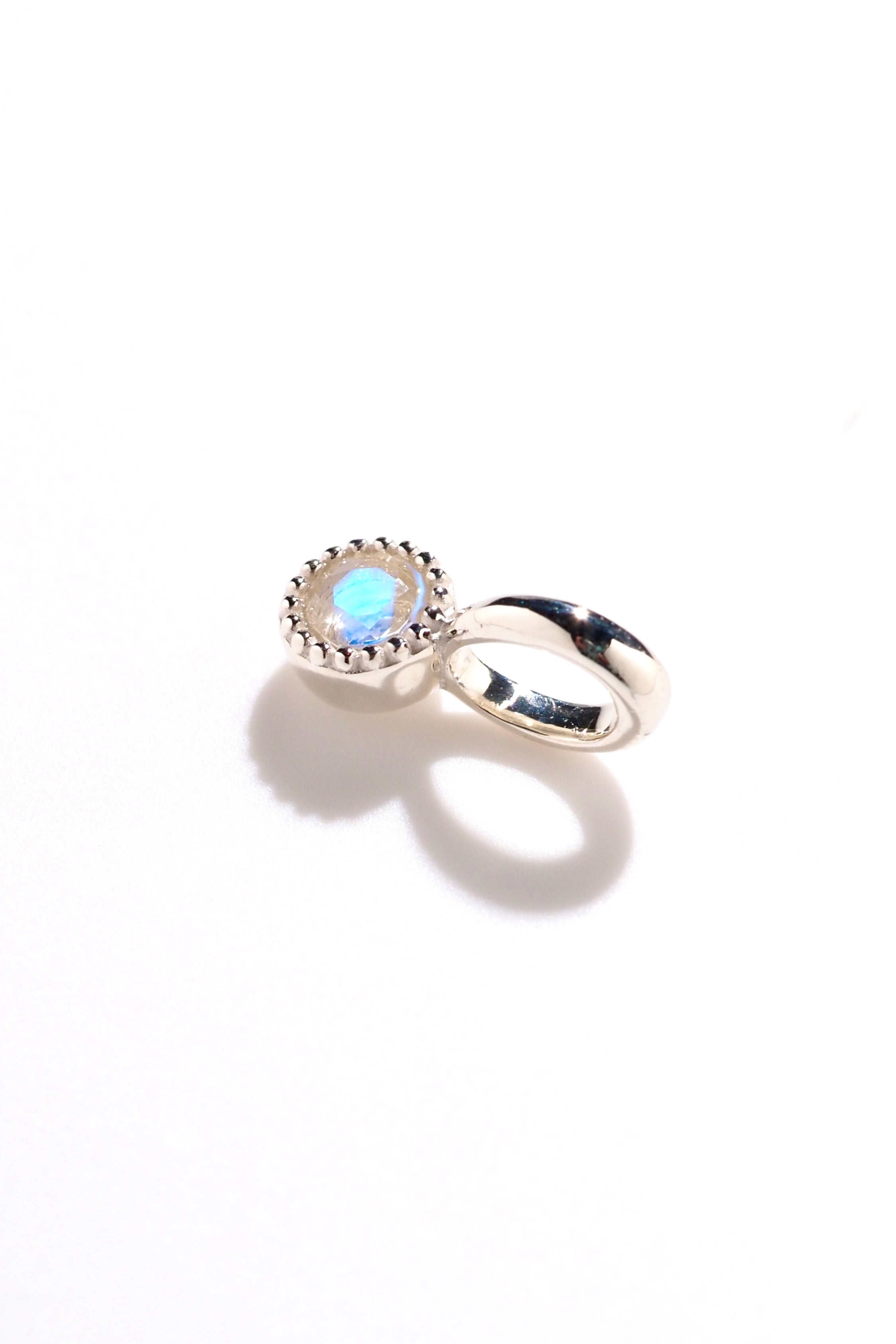 宝石をぐるりと囲む細やかなミルグレインが、クラシカルで温かみのある印象を演出。スターリングシルバーの素材がブルームーンストーンの透明感を際立たせています。小ぶりながらも存在感があり、どの角度から見ても繊細な光を放ちます。