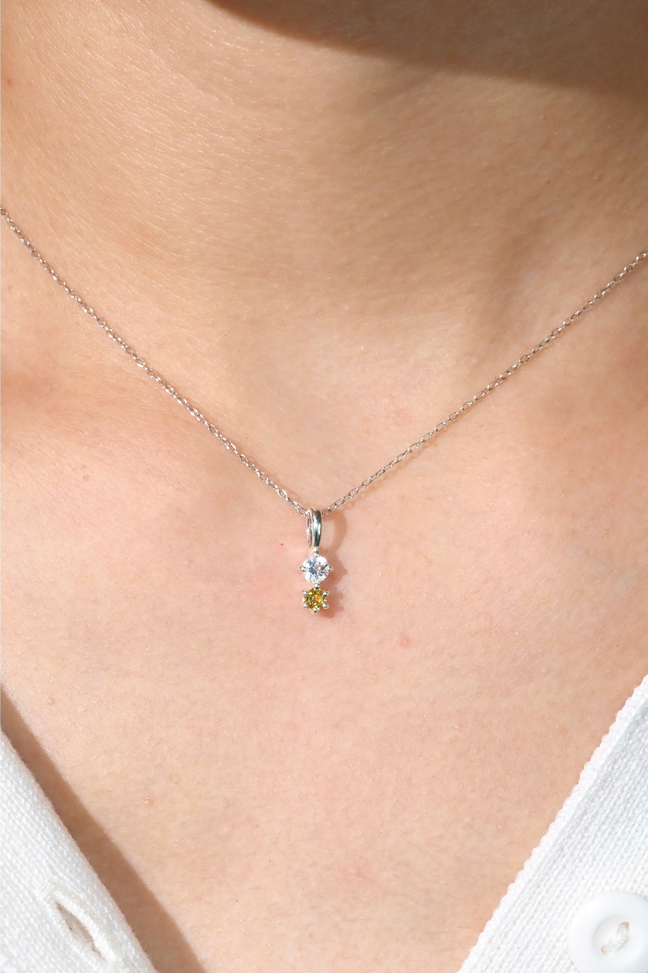 上部には透明感あふれるダンビュライト、下部には鮮やかなイエローサファイアをセットし、異なる光のニュアンスを胸元で楽しめます。