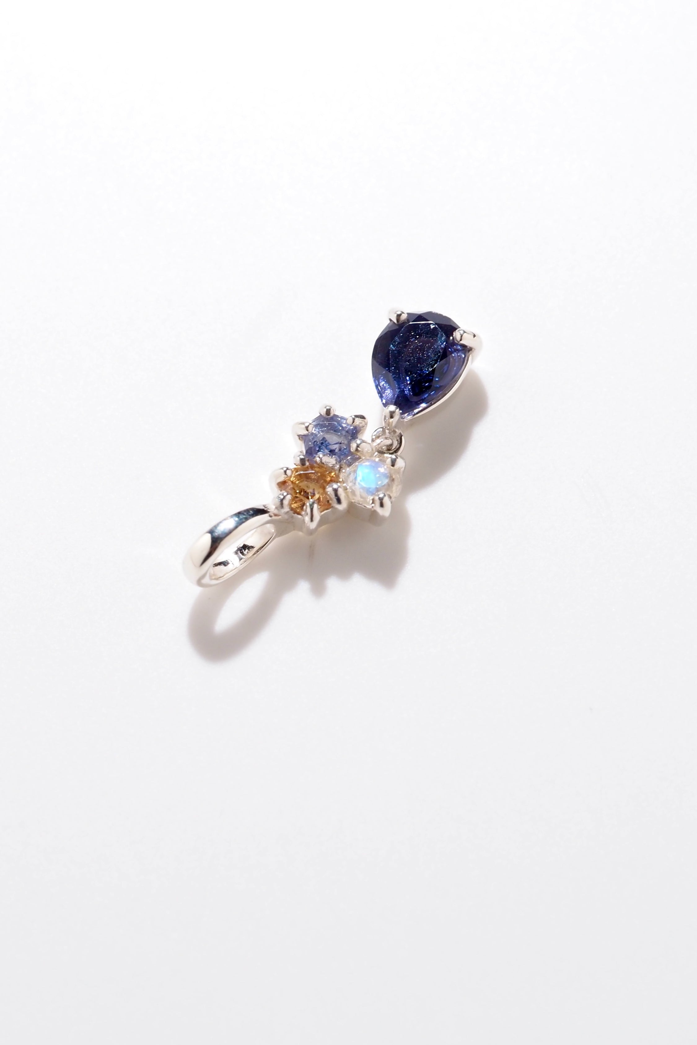深く澄んだブルーのアイオライトを主役に、ロイヤルブルームーンストーン、タンザナイト、イエローサファイアが織りなす多彩な輝きが、まるで星座のように散りばめられています。