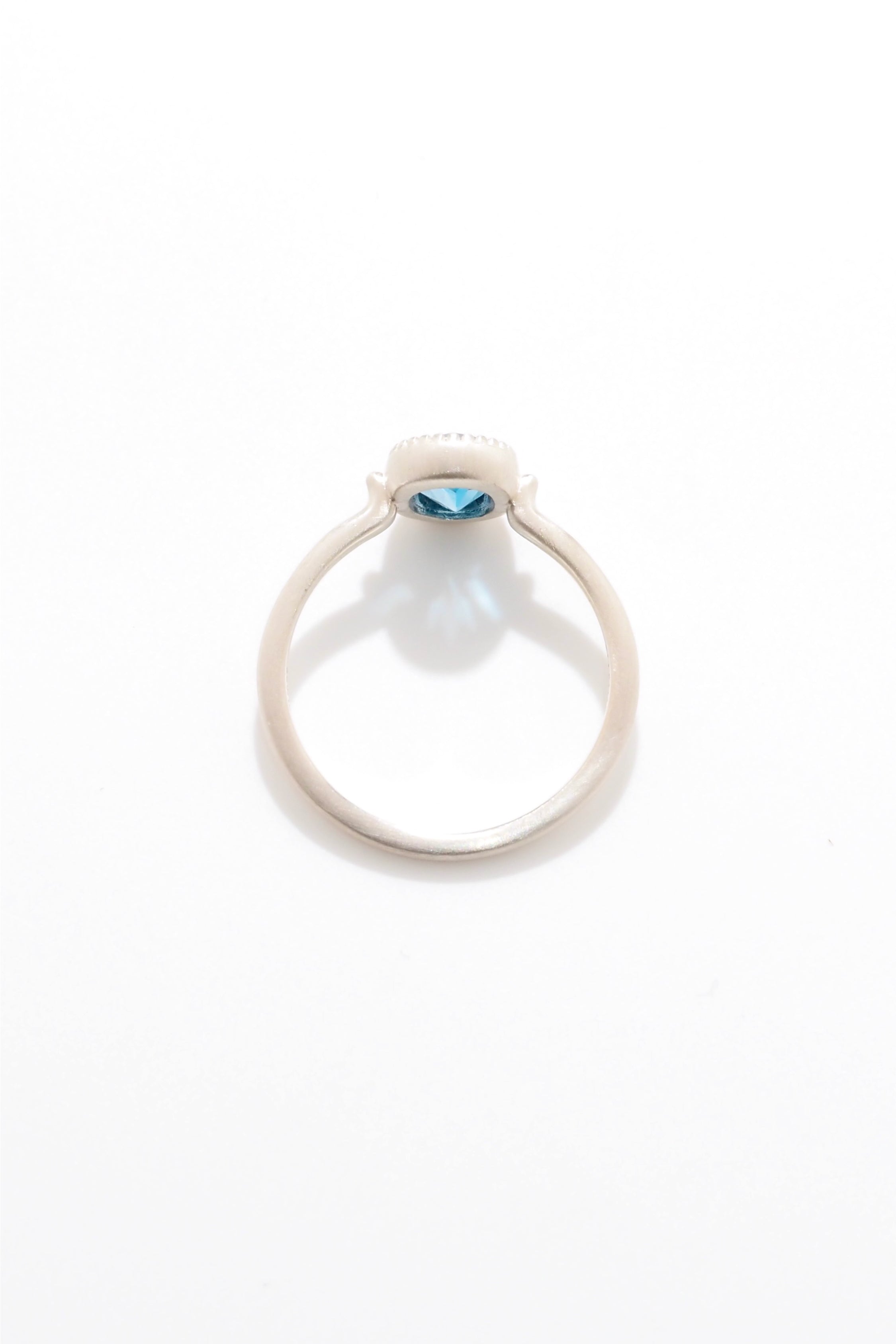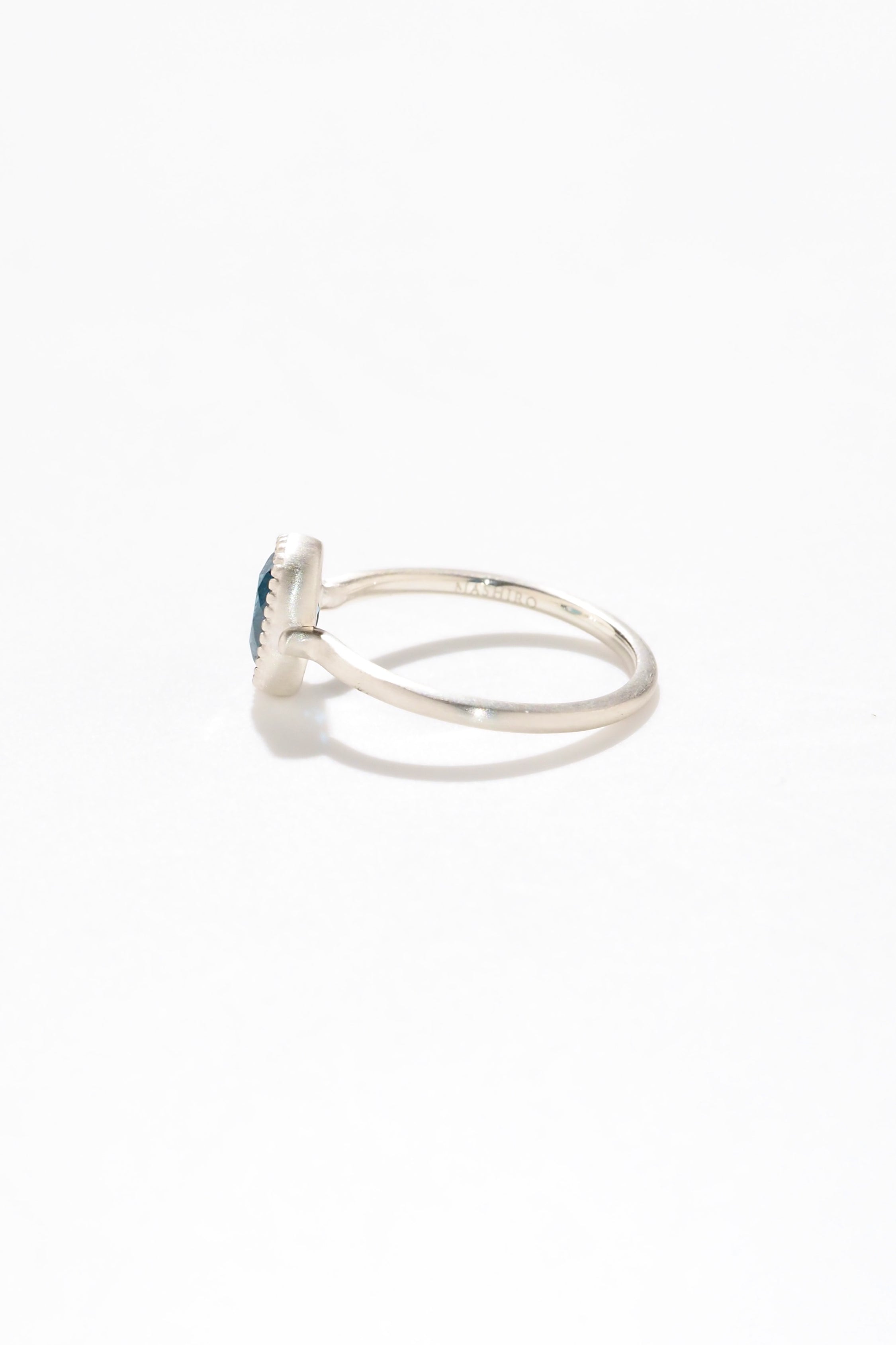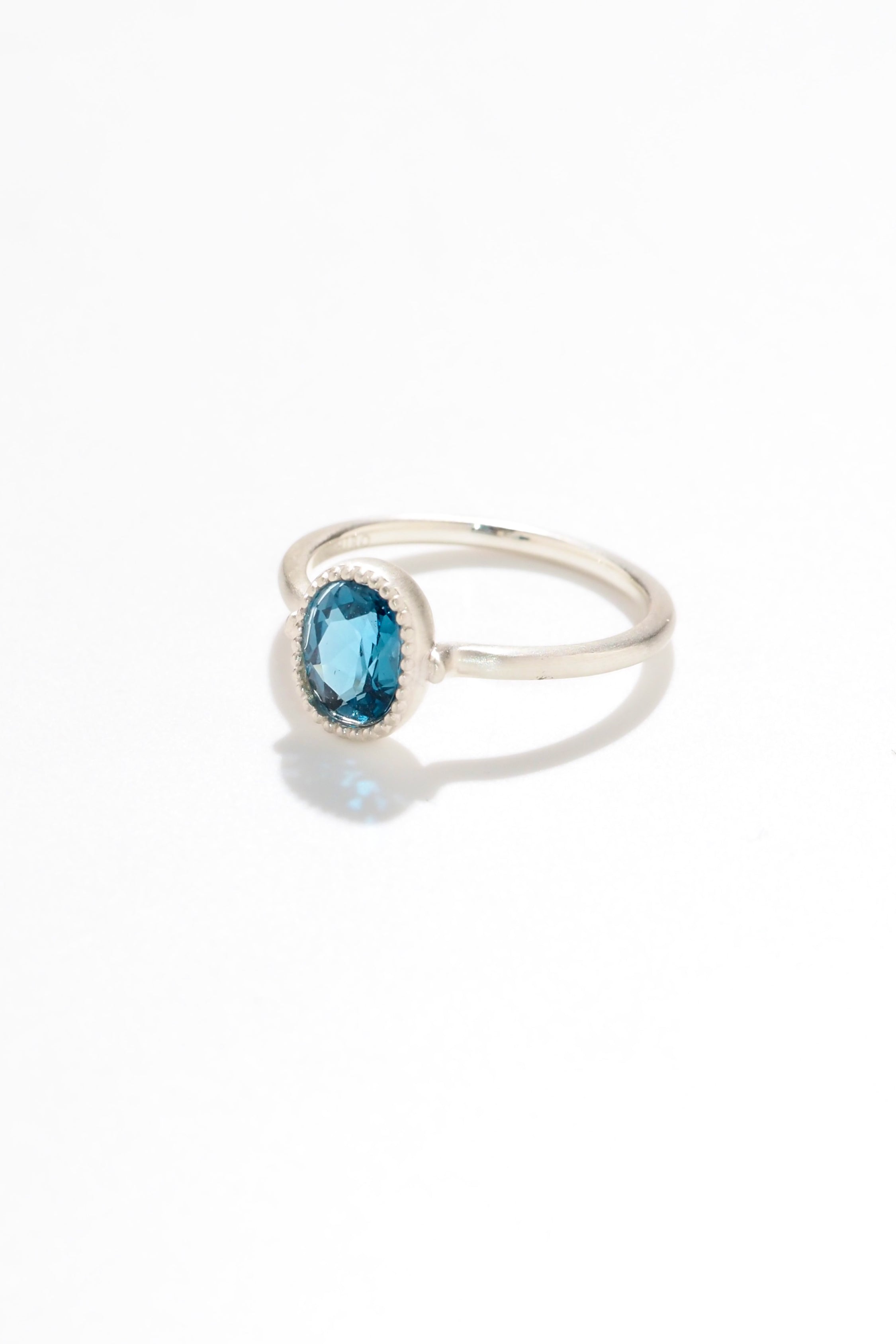 深みのあるロンドンブルーが、指先に静かで凛とした輝きを添えるリング。繊細なミルグレイン装飾とマット仕上げが、宝石の色彩をより一層引き立てます。
