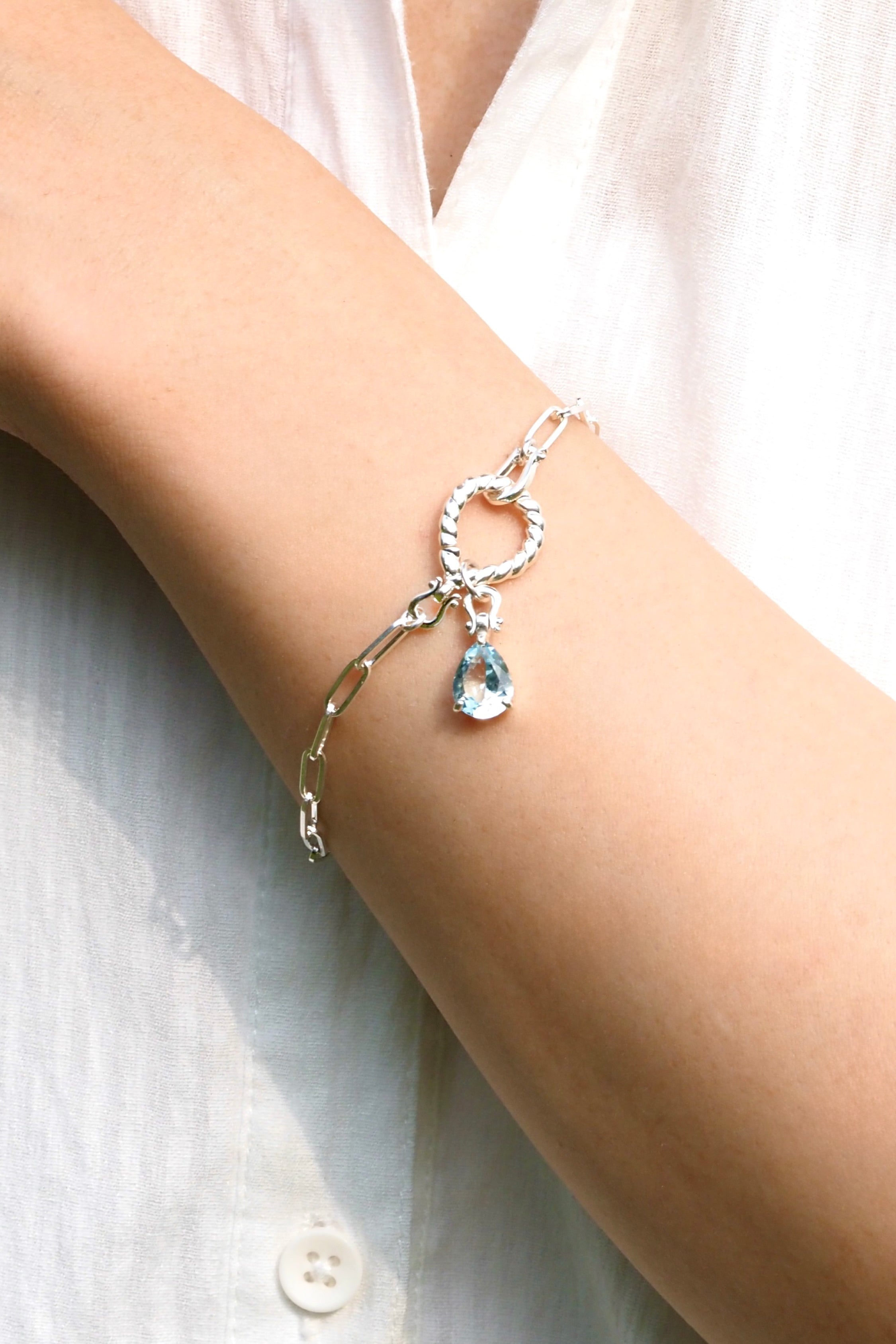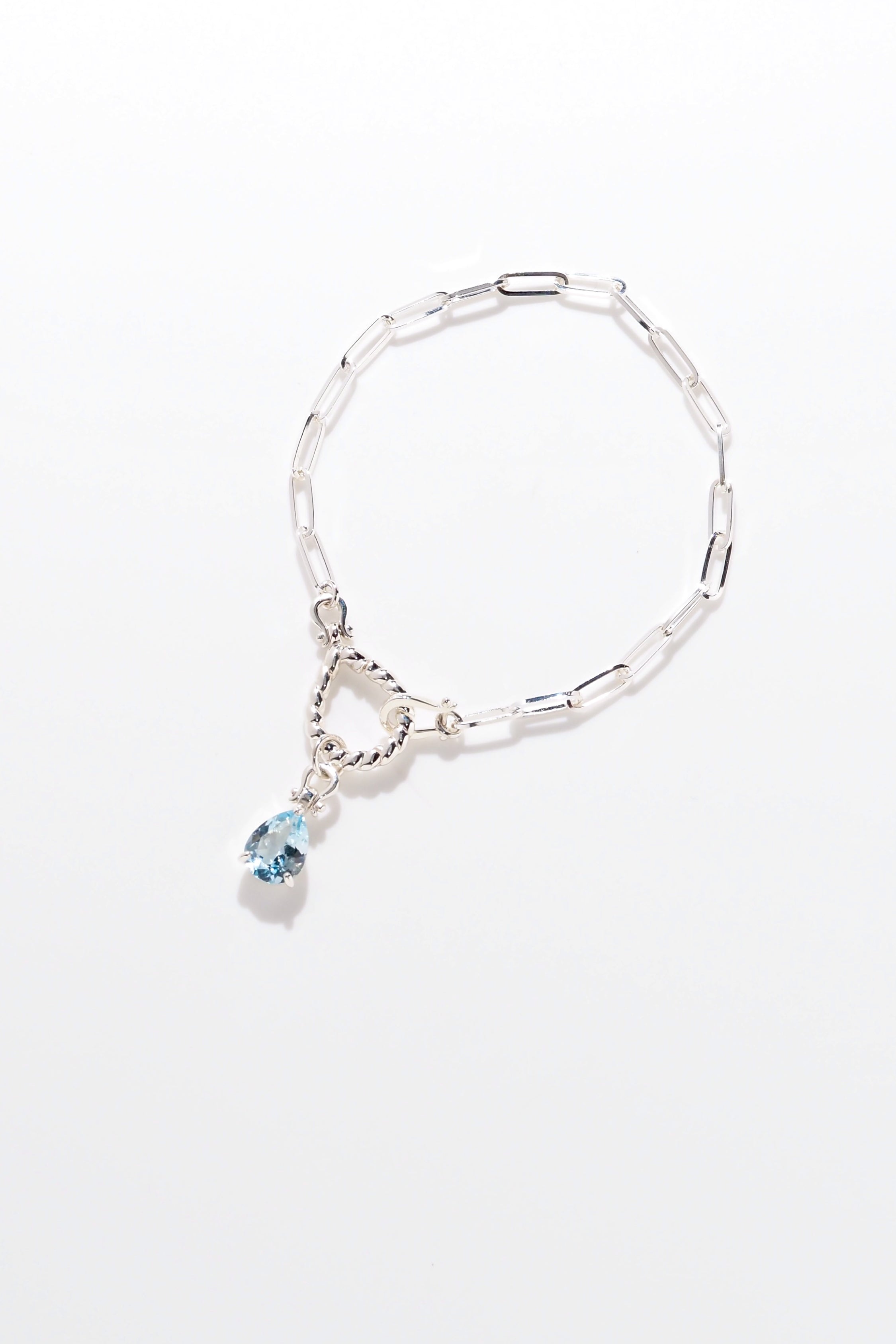 ブラジル産アクアマリンの中でも、特に高い透明度とみずみずしい発色を誇るペアシェイプ個体を主役に仕立てたオメガループブレスレット。