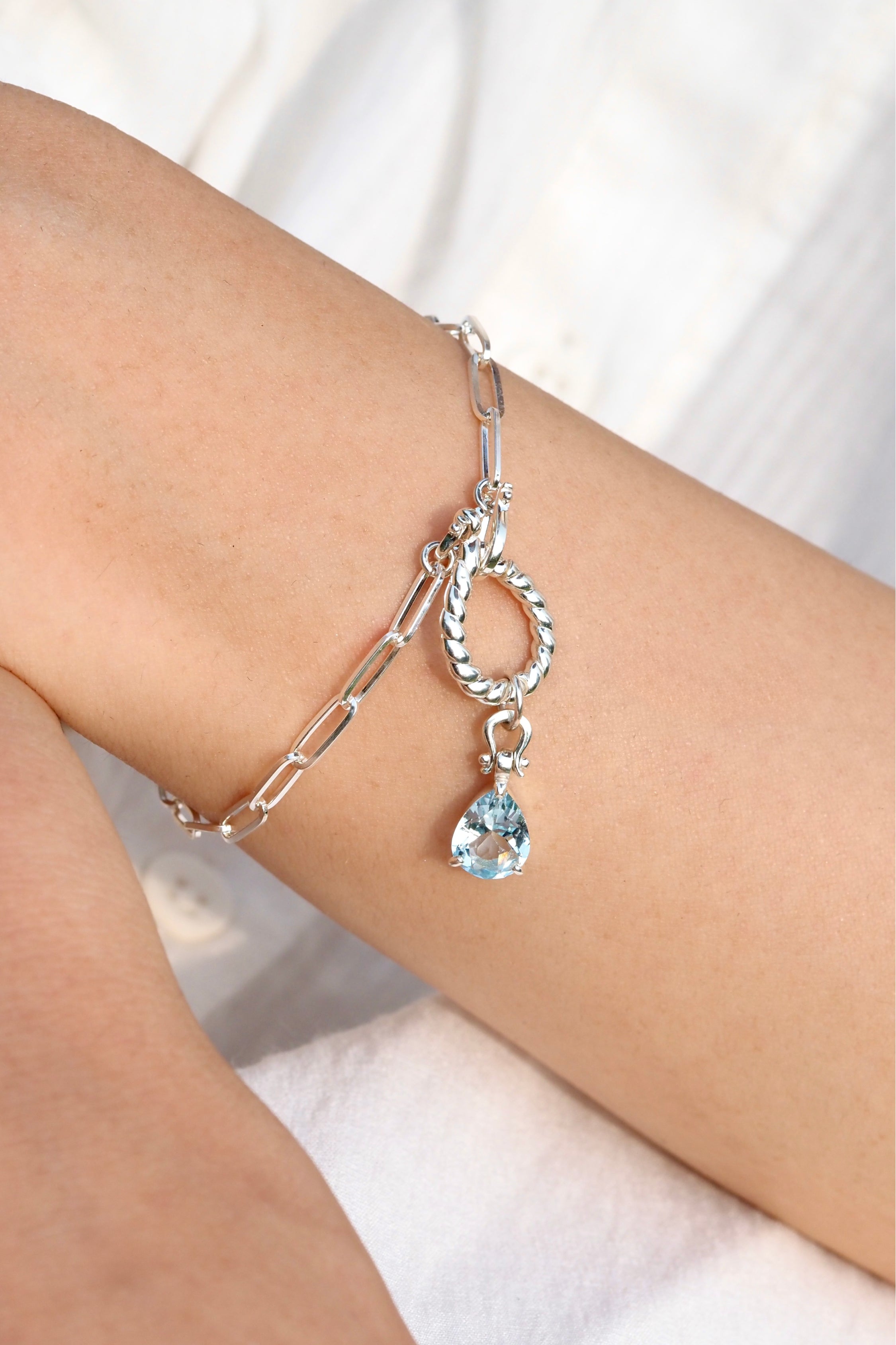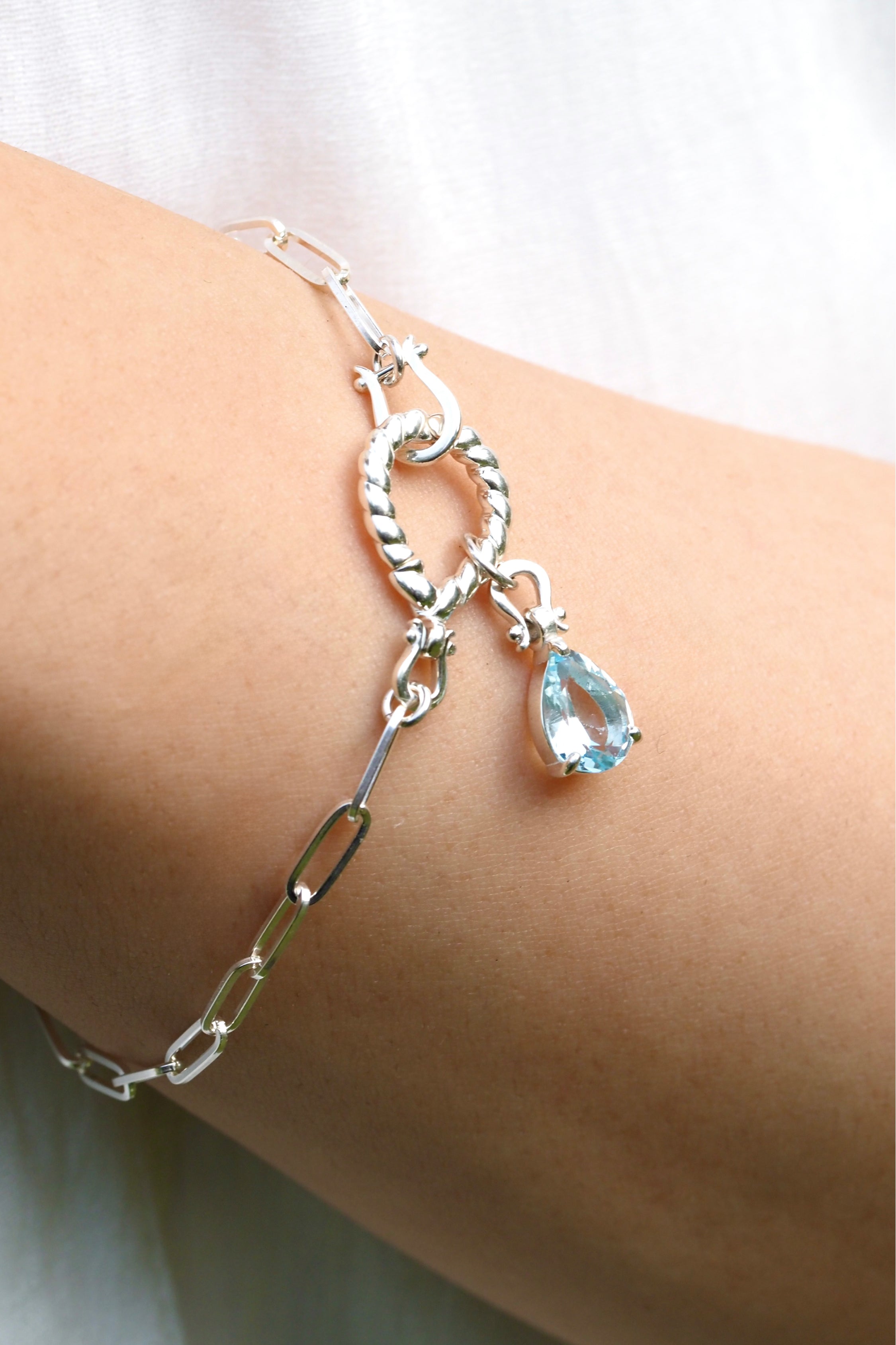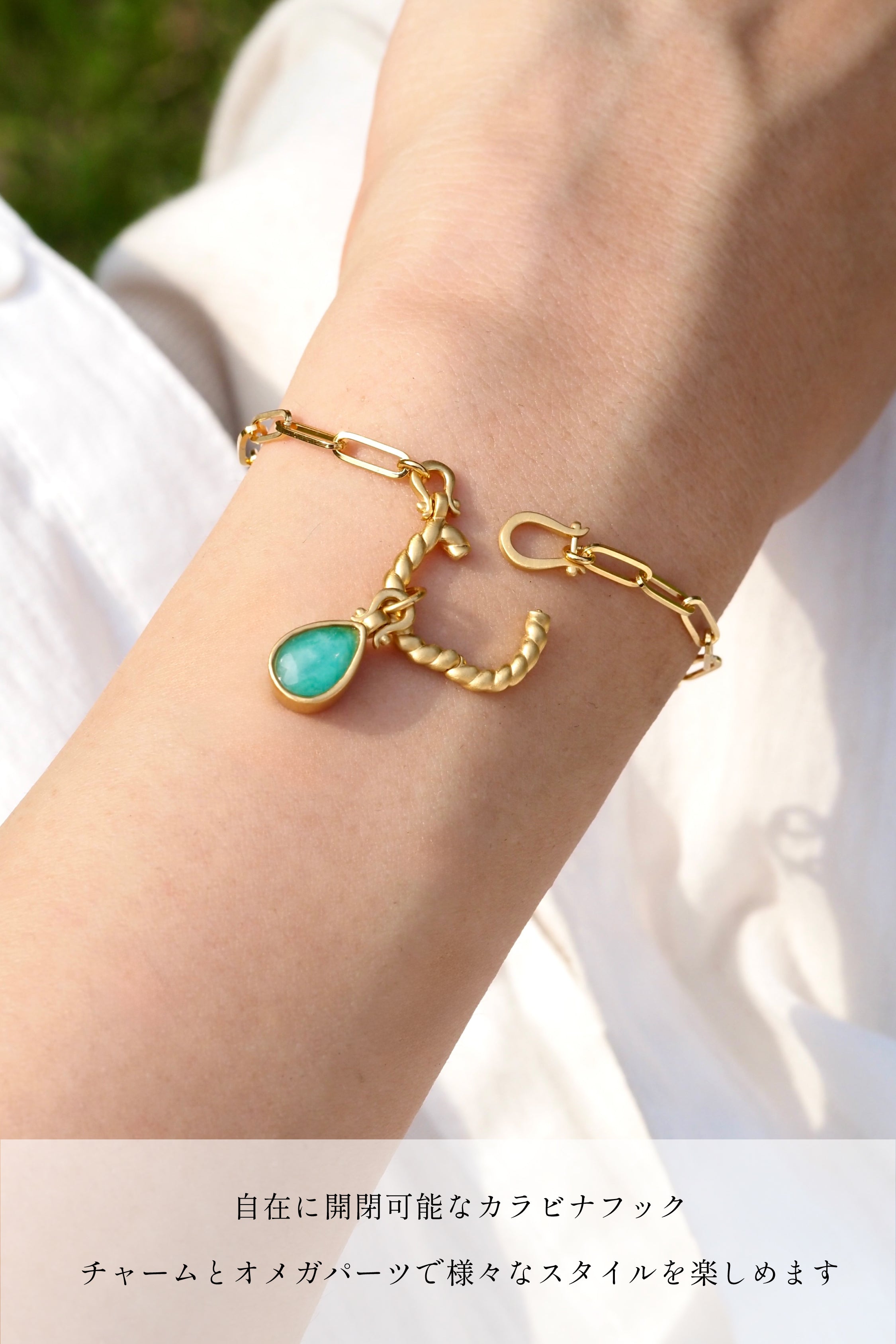 ネックレス版と異なりYラインのアレンジはありませんが、シンプルなブレスレットとしての完成度を高め、チャームを付け替えることで印象を自在に変えることができます。