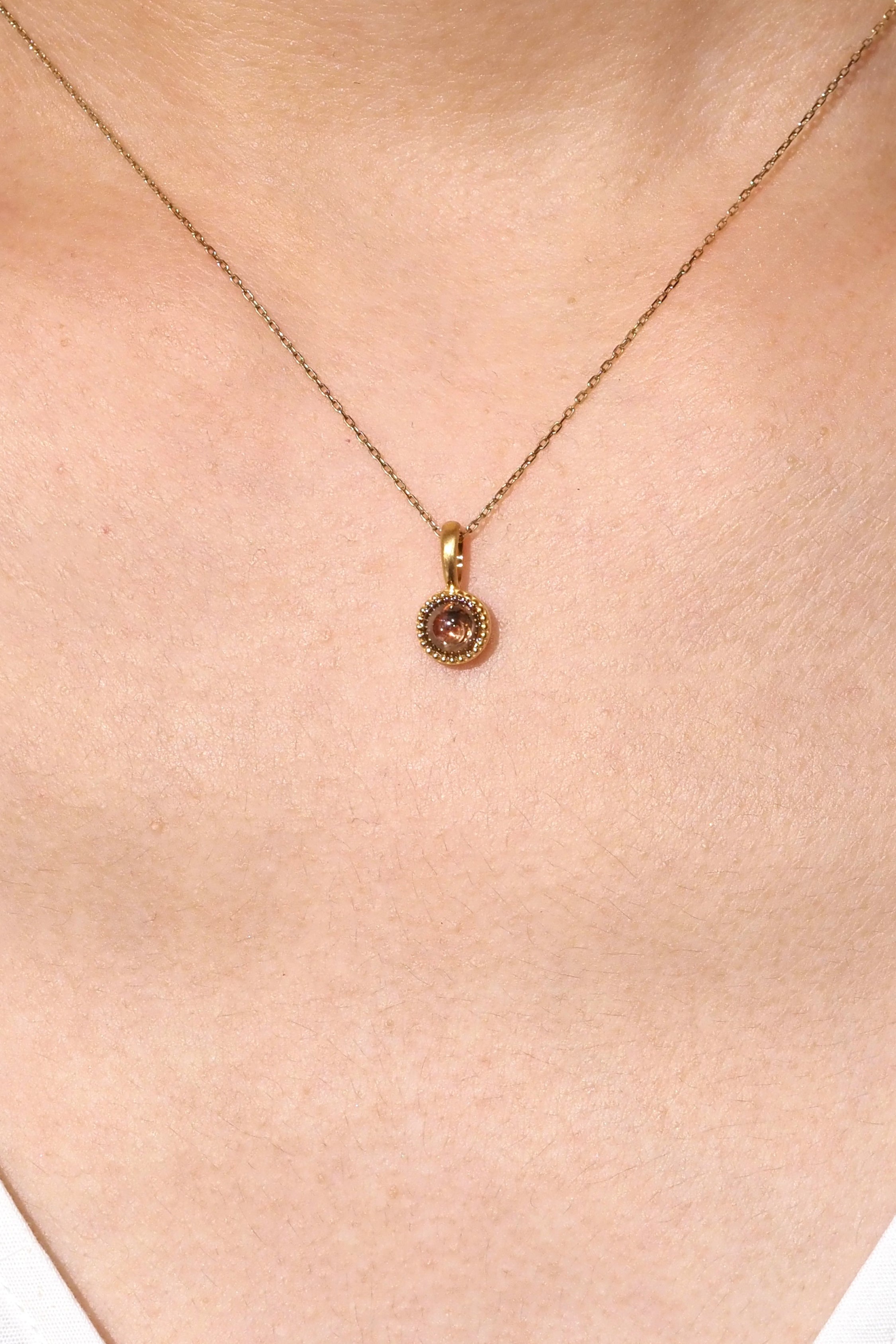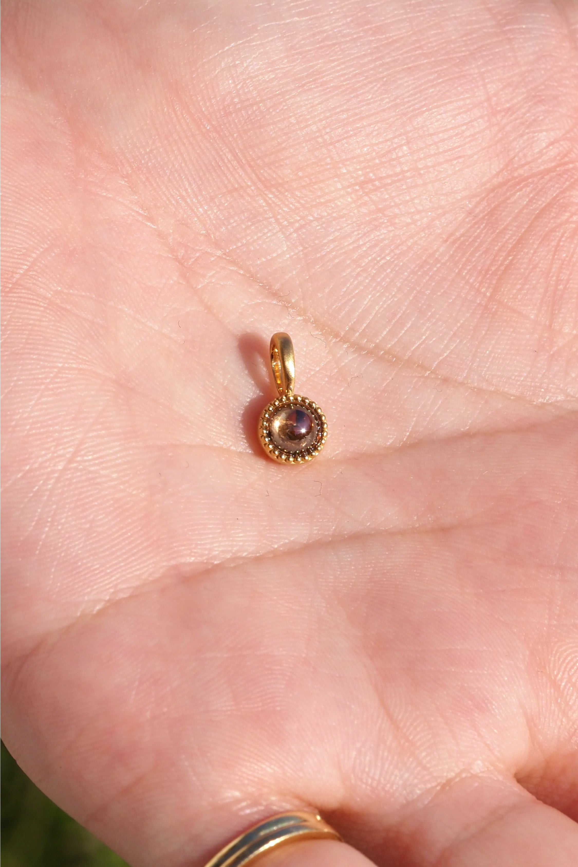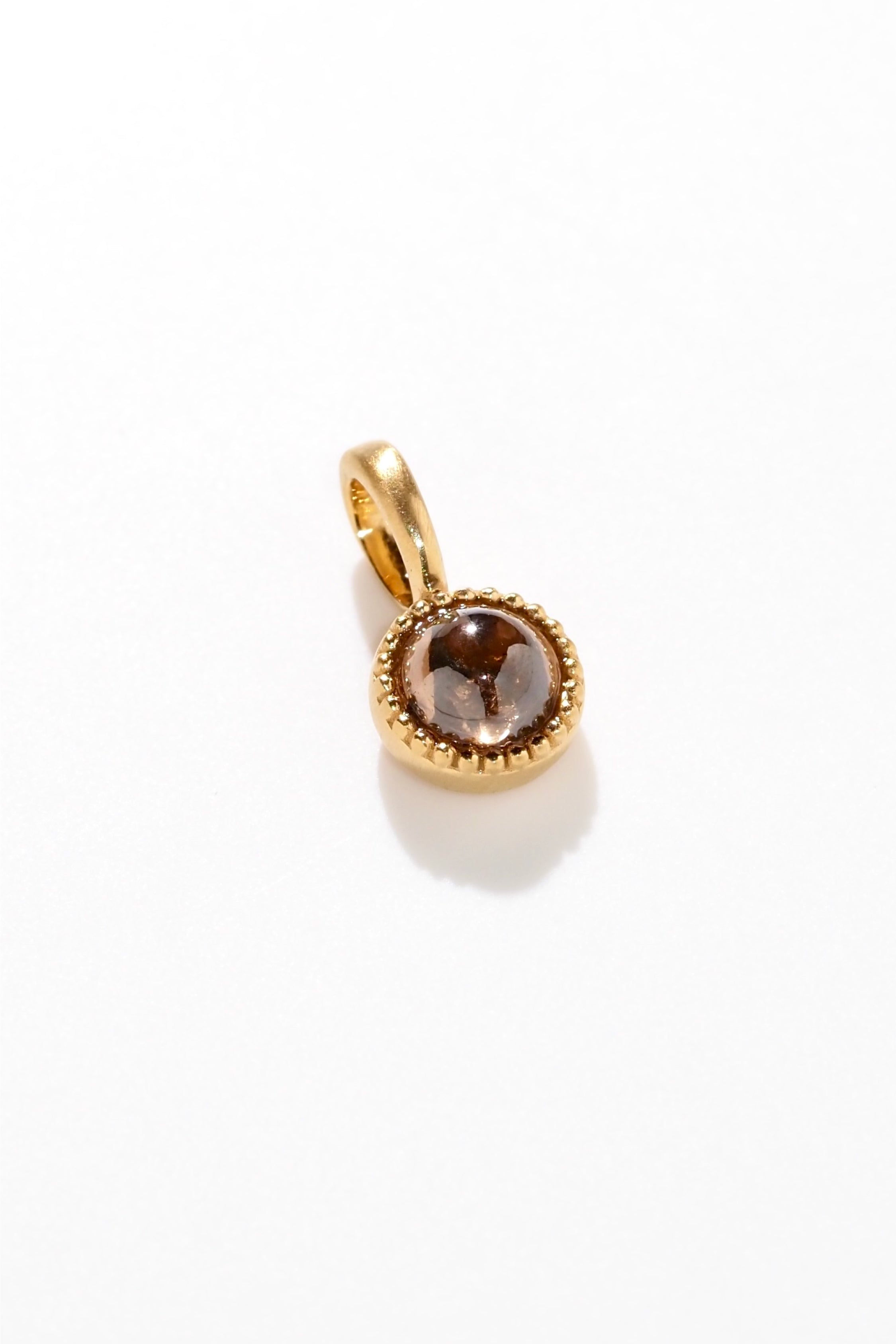 ぷっくりと丸みを帯びたカボションカットが、ブリリアントカットとは異なる柔らかな艶めきを放ち、アンティークな趣を感じさせるチャームです。