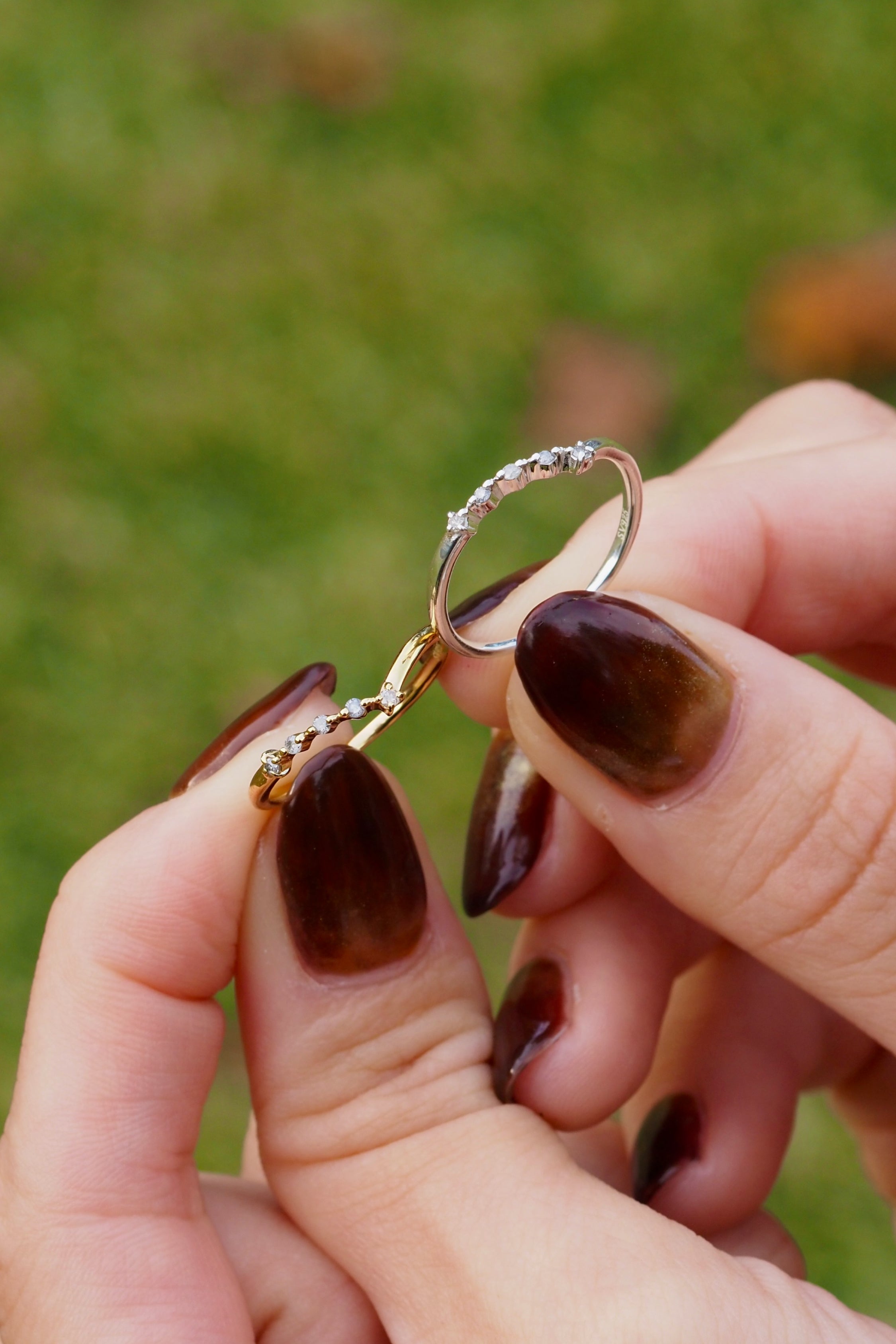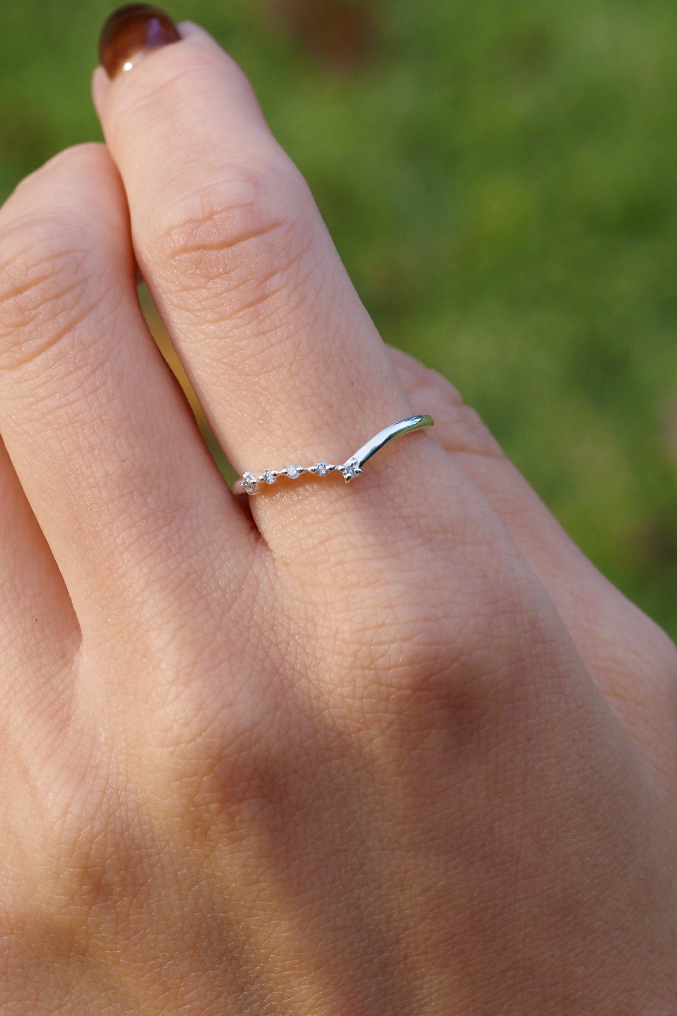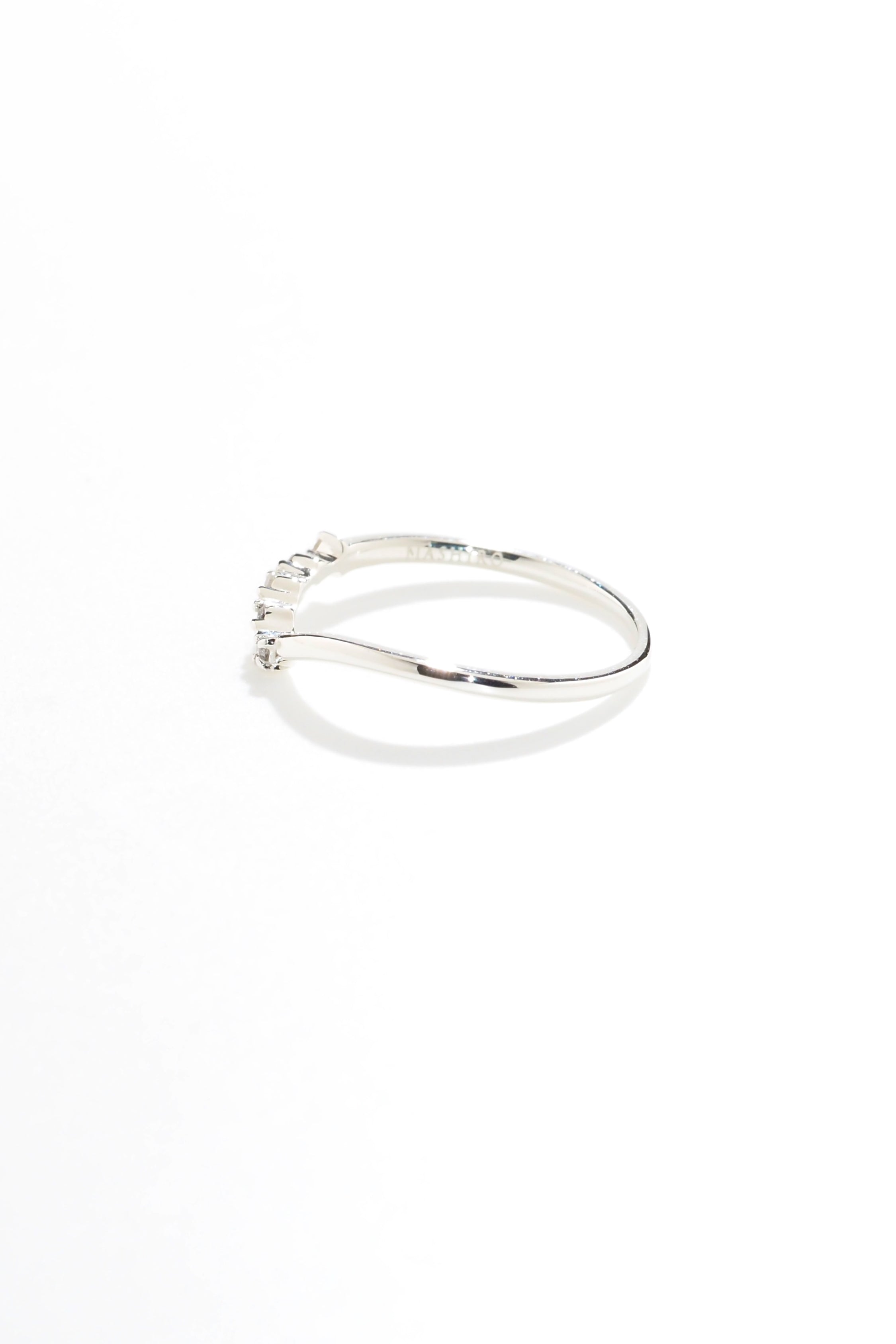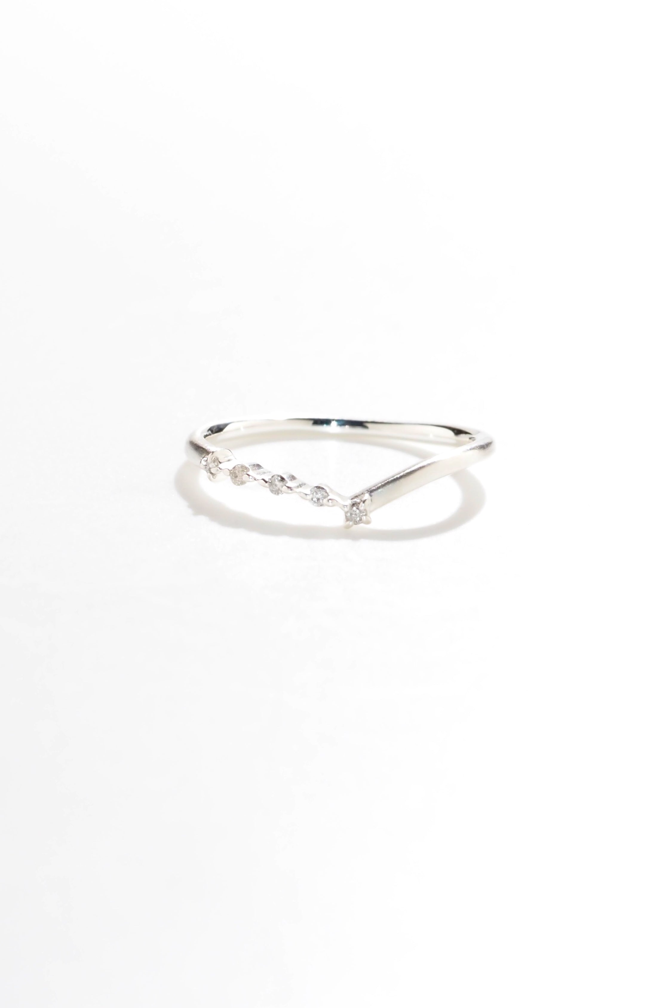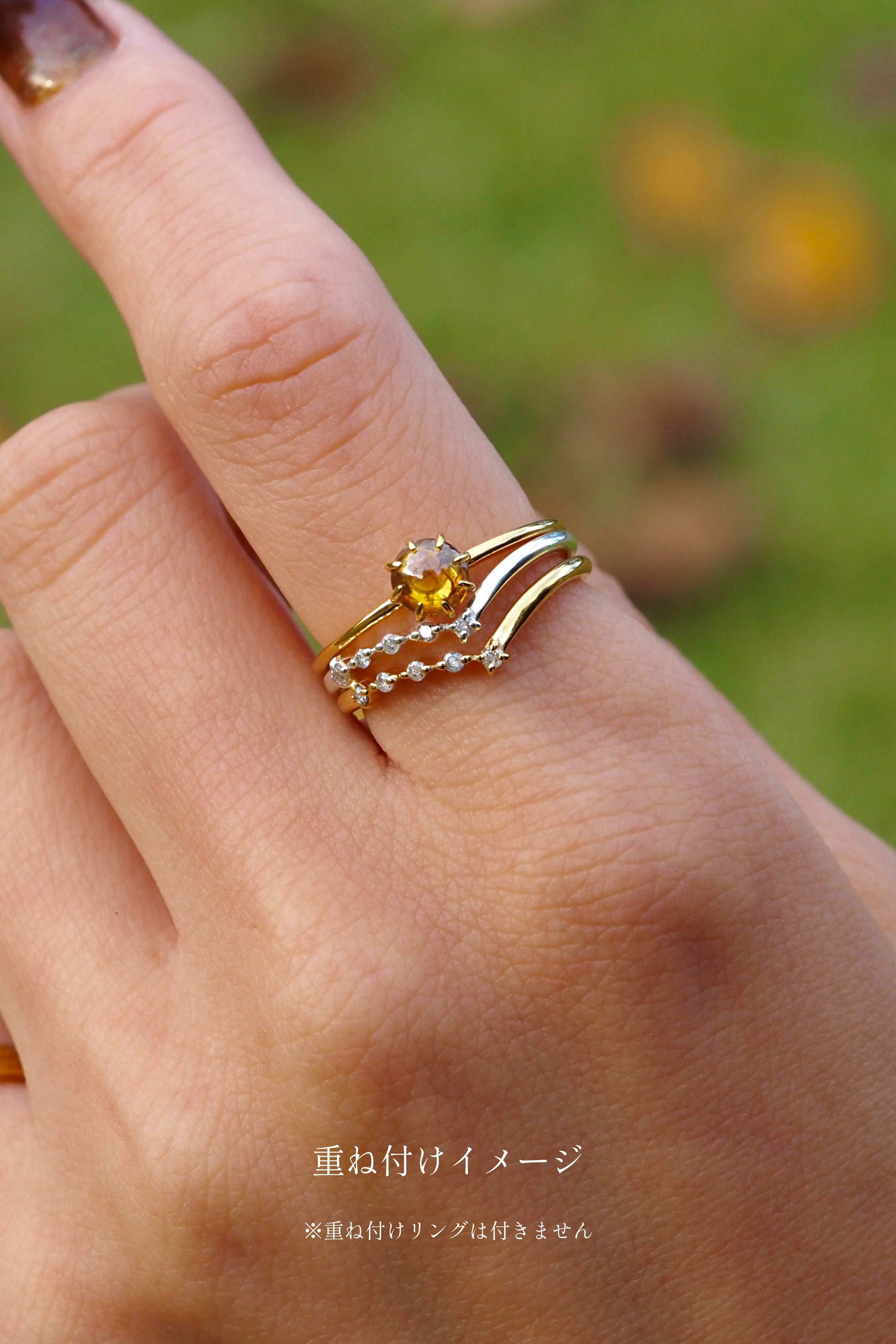 カラーストーンリングとの“重ね付け専用リング”として開発された、流星デザインのダイヤモンドVラインリング。