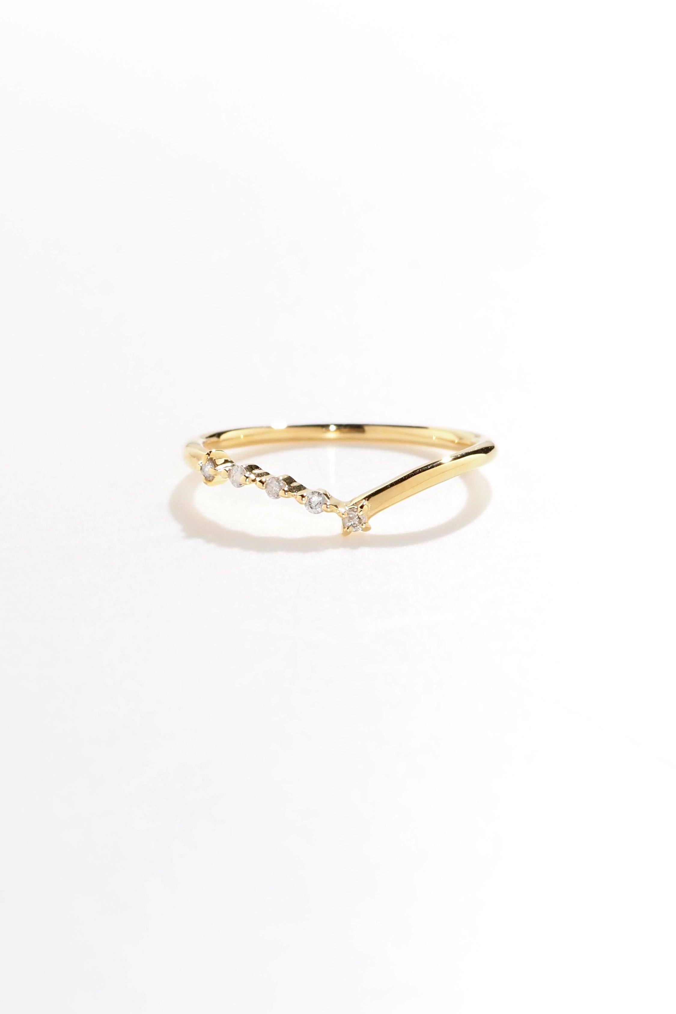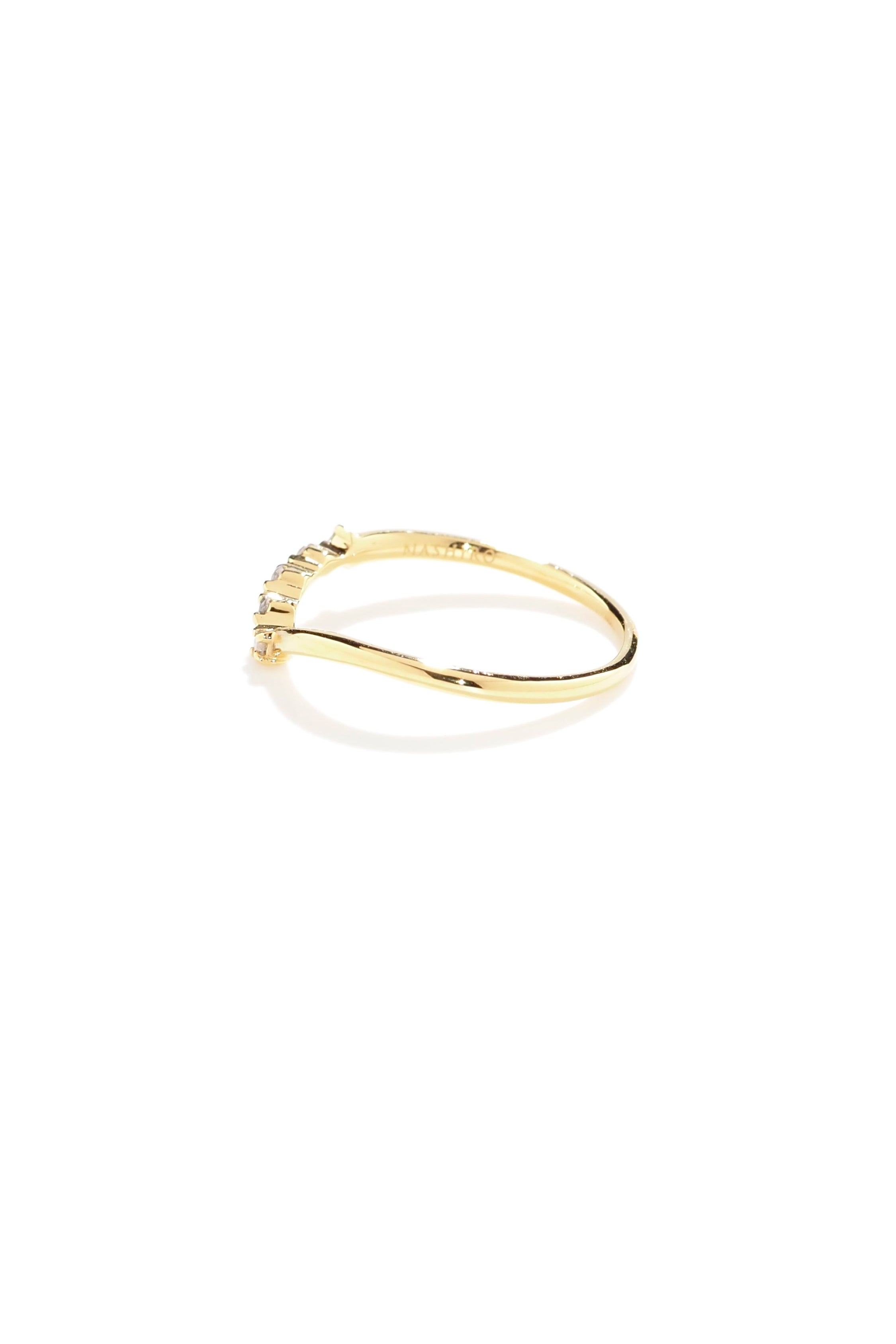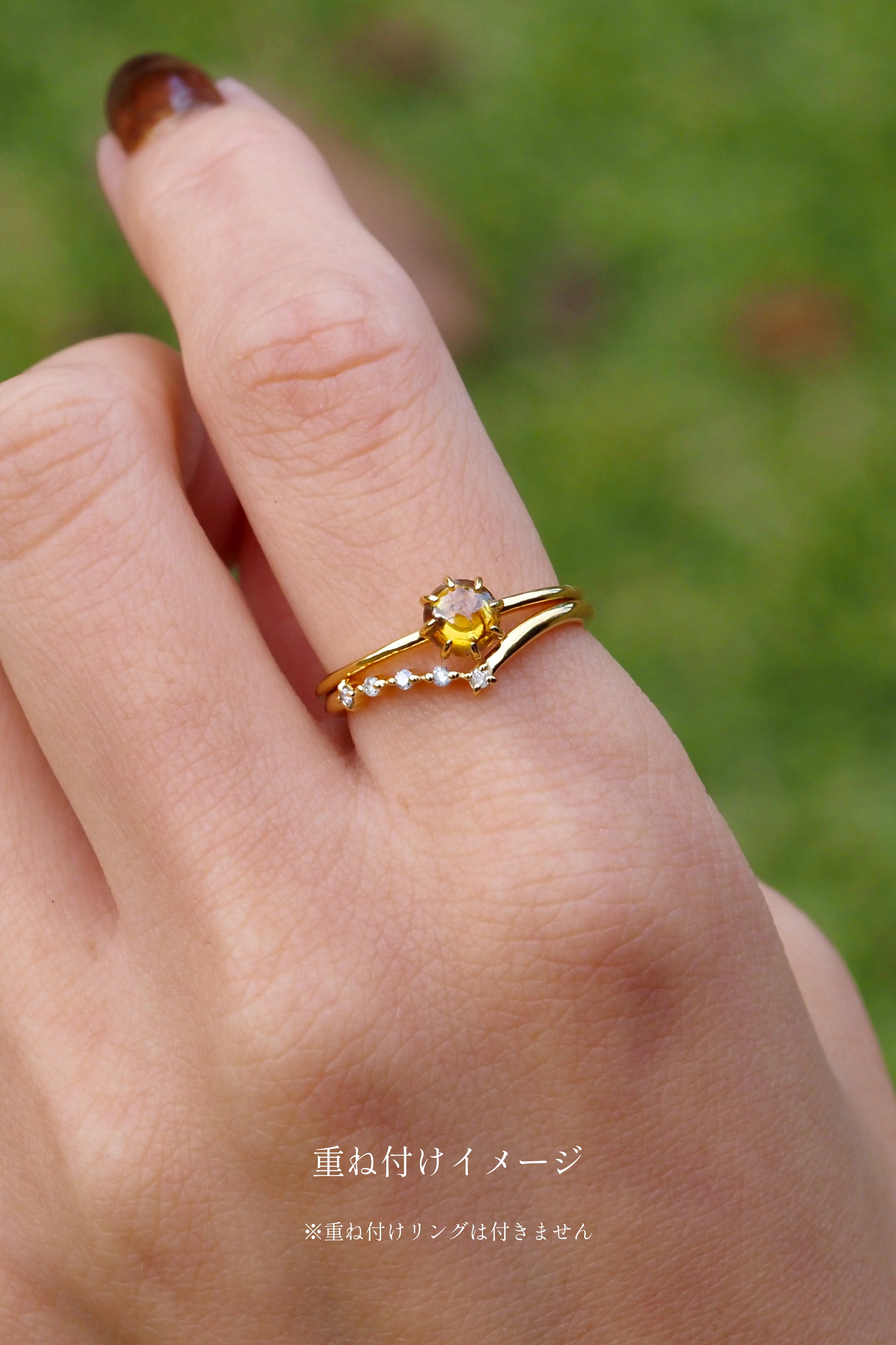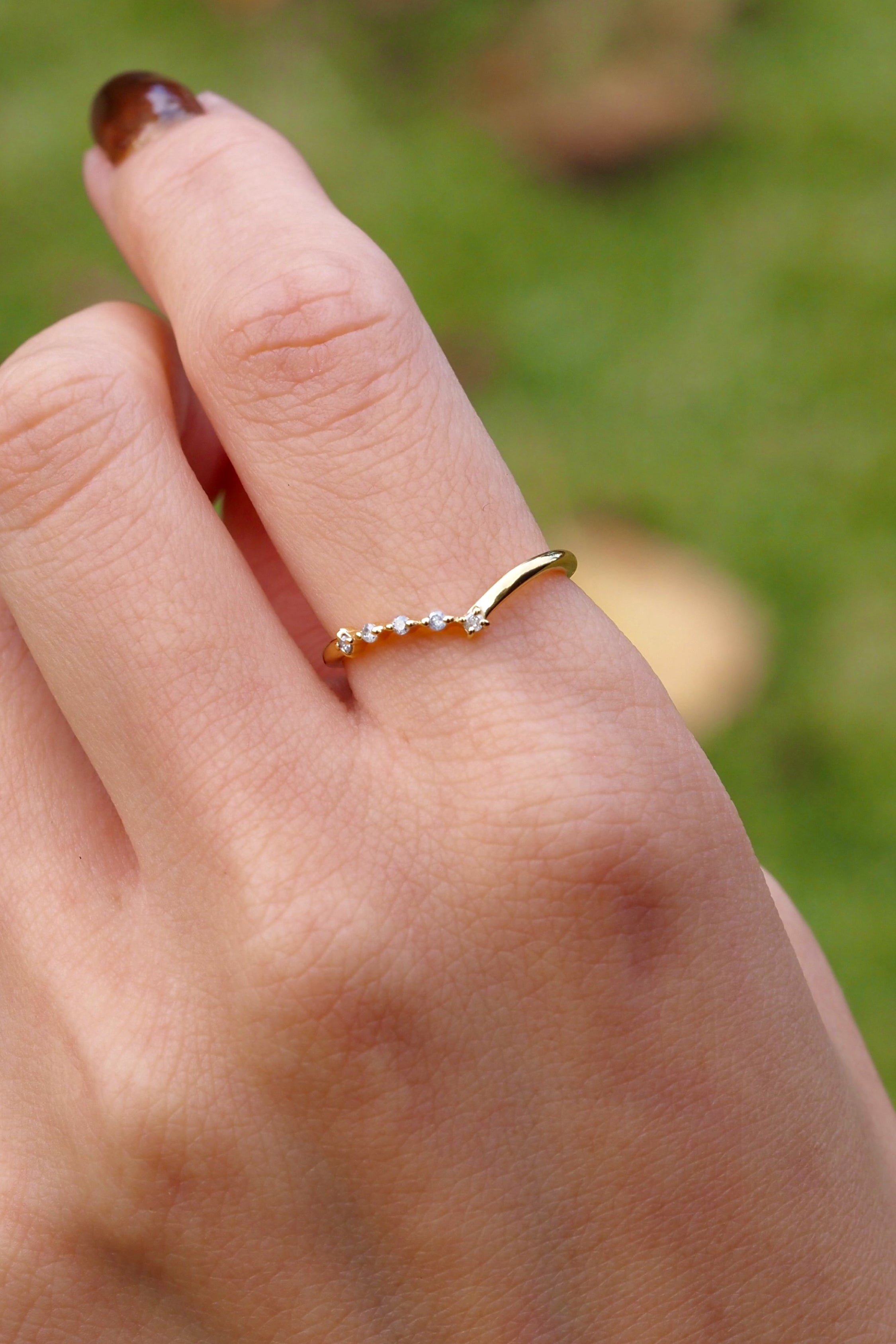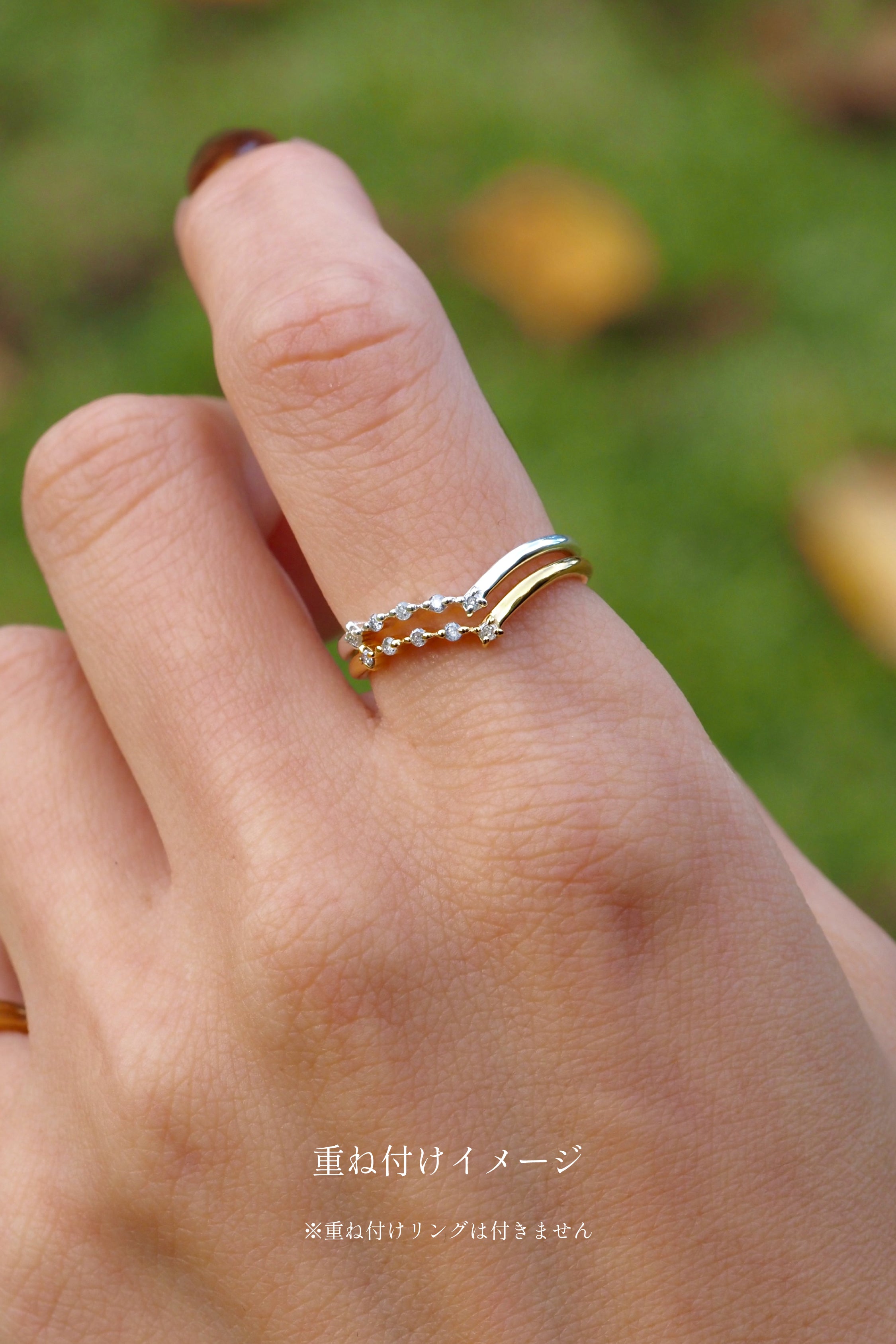 カラーストーンリングとの“重ね付け専用リング”として開発された、流星デザインのダイヤモンドVラインリング。