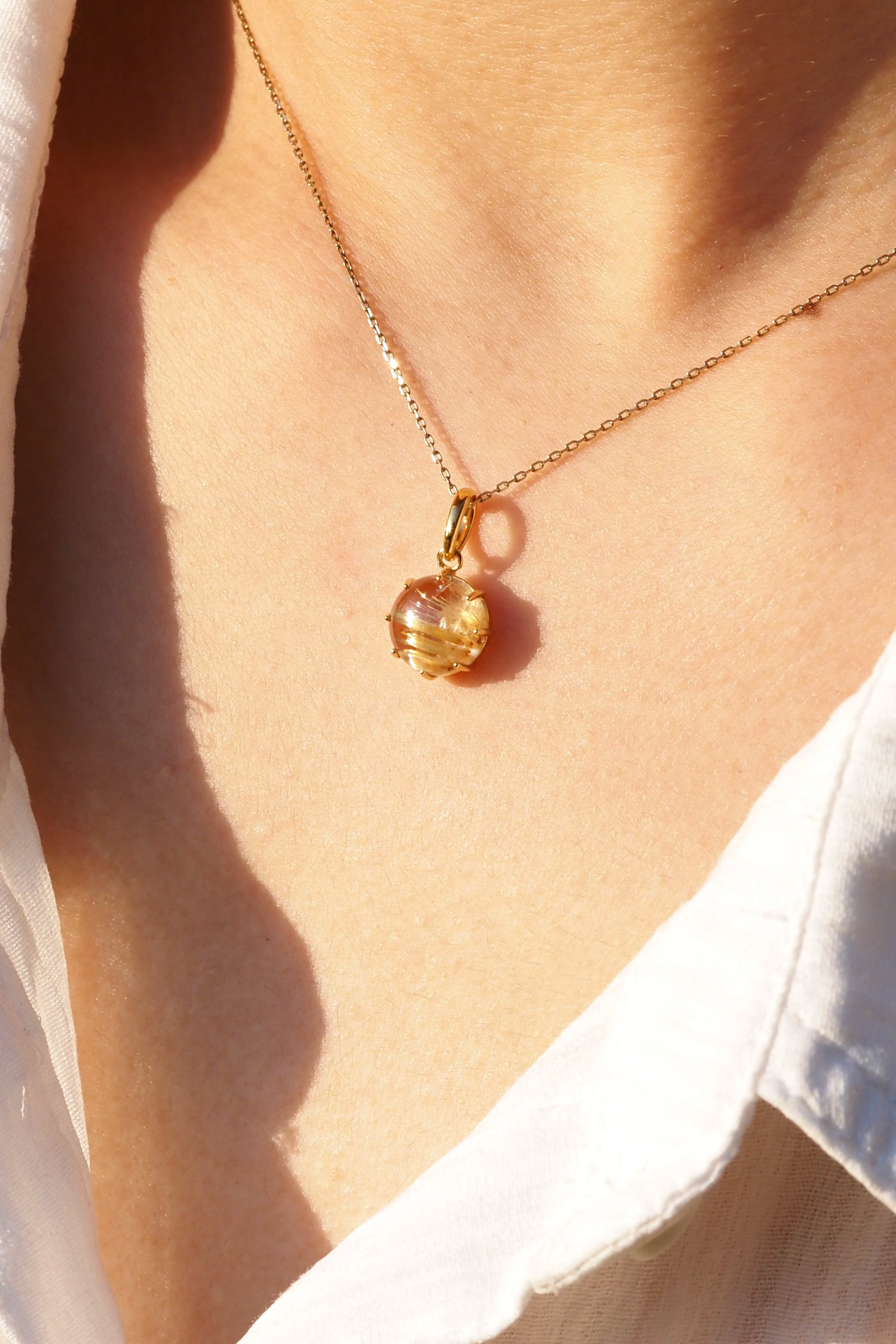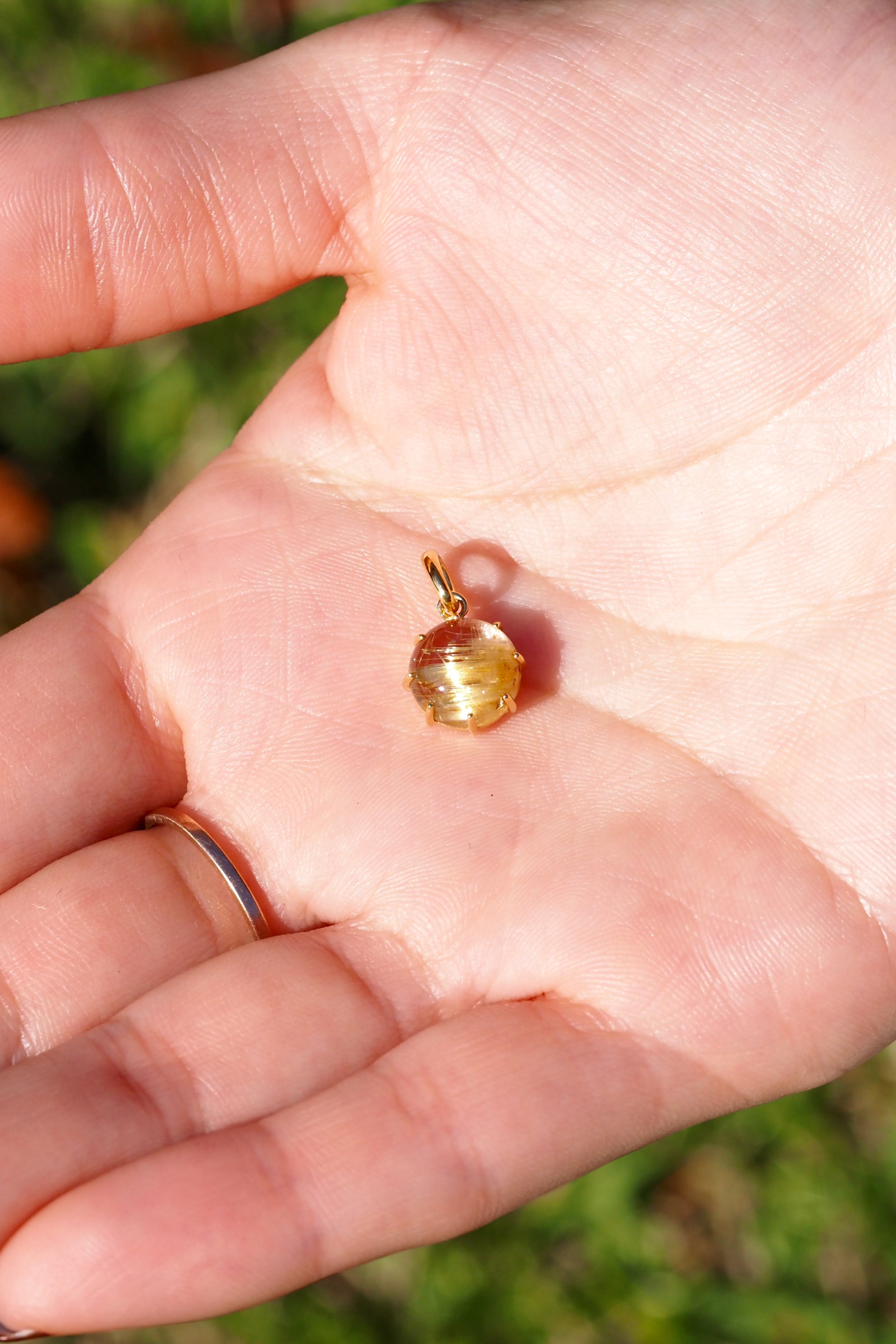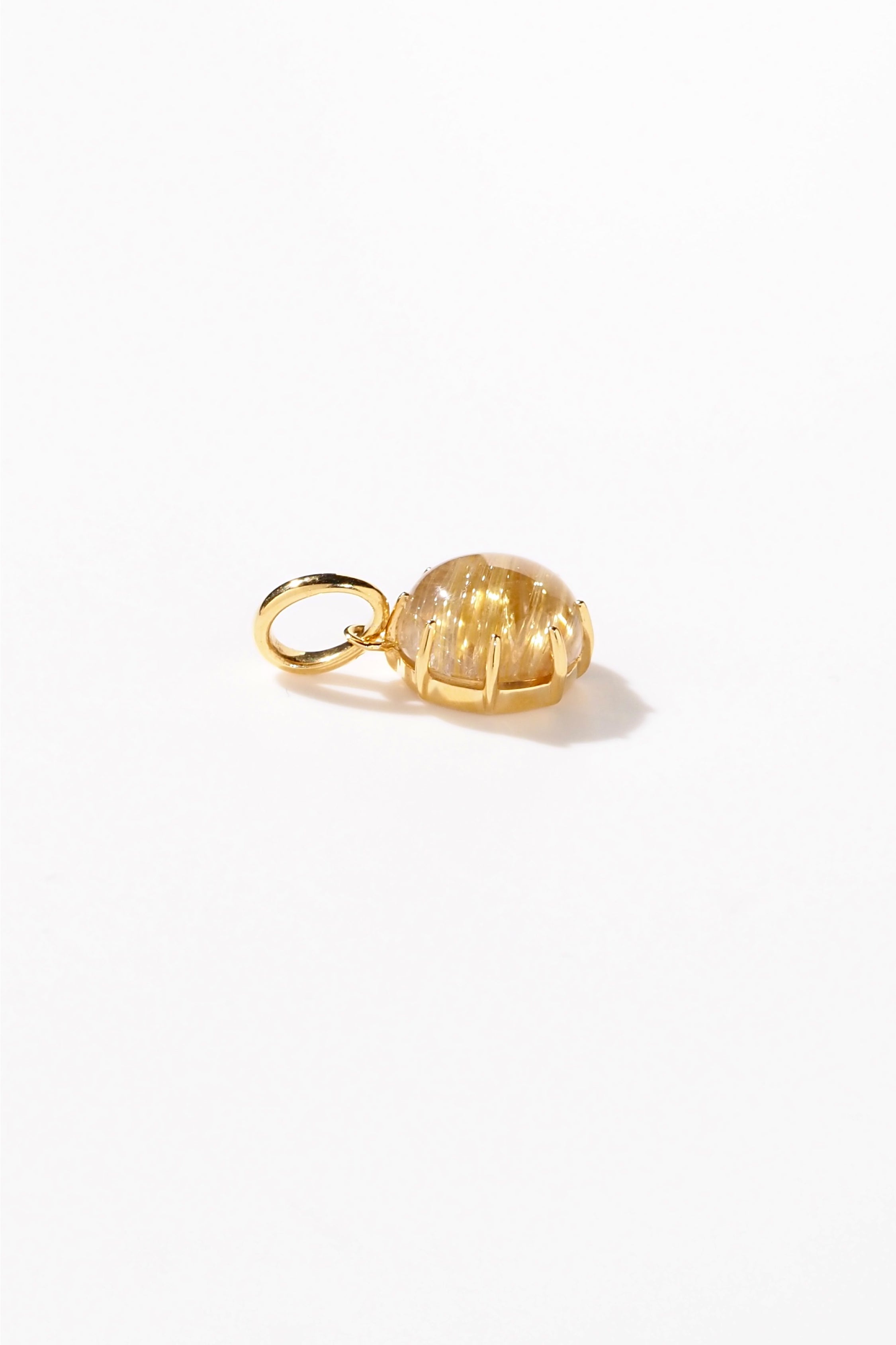 ぷっくりと愛らしいラウンドカボションに、金糸が柔らかく走る極上のゴールドルチルクォーツキャッツアイを贅沢にセットしたスイングチャーム。