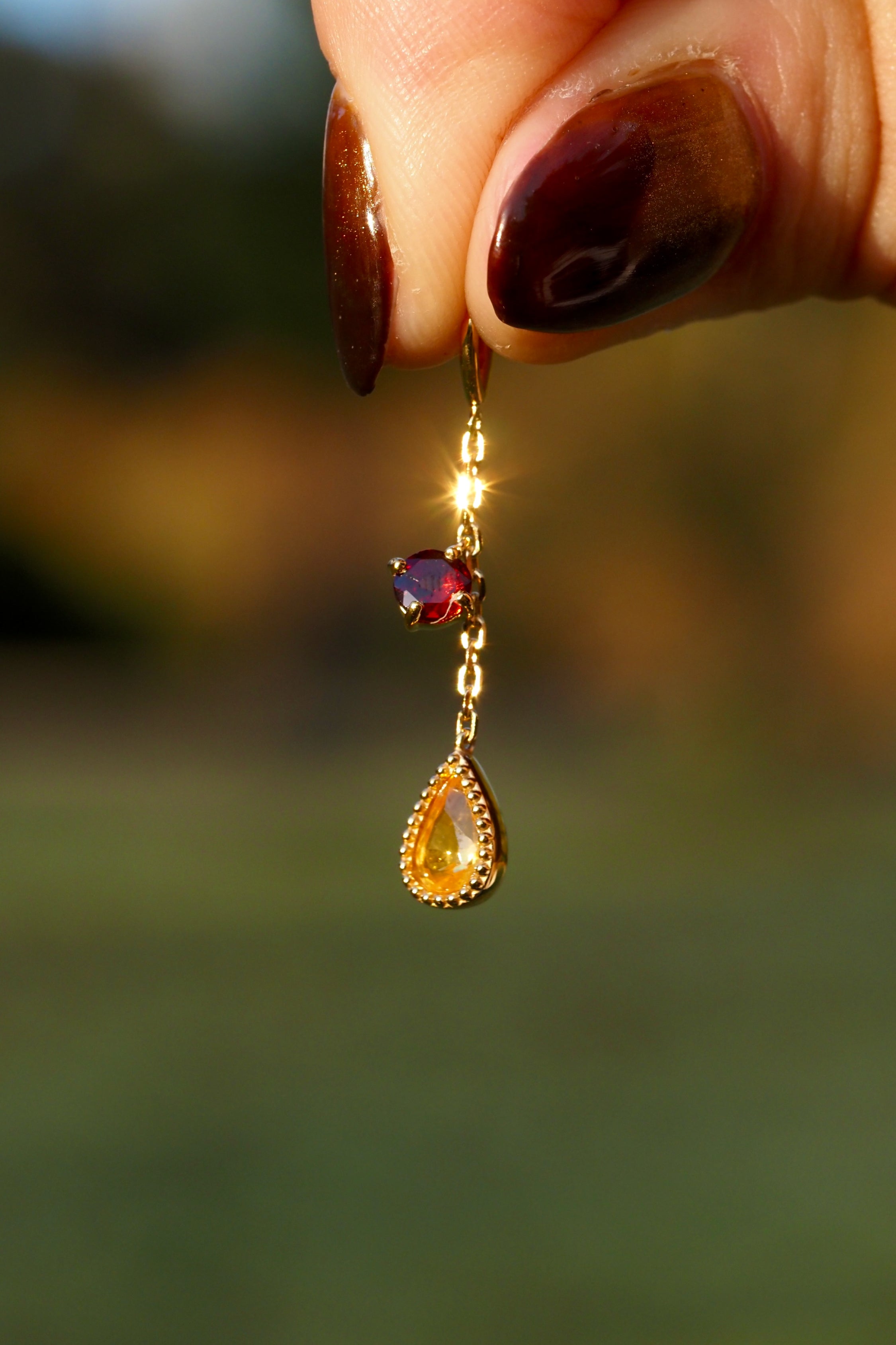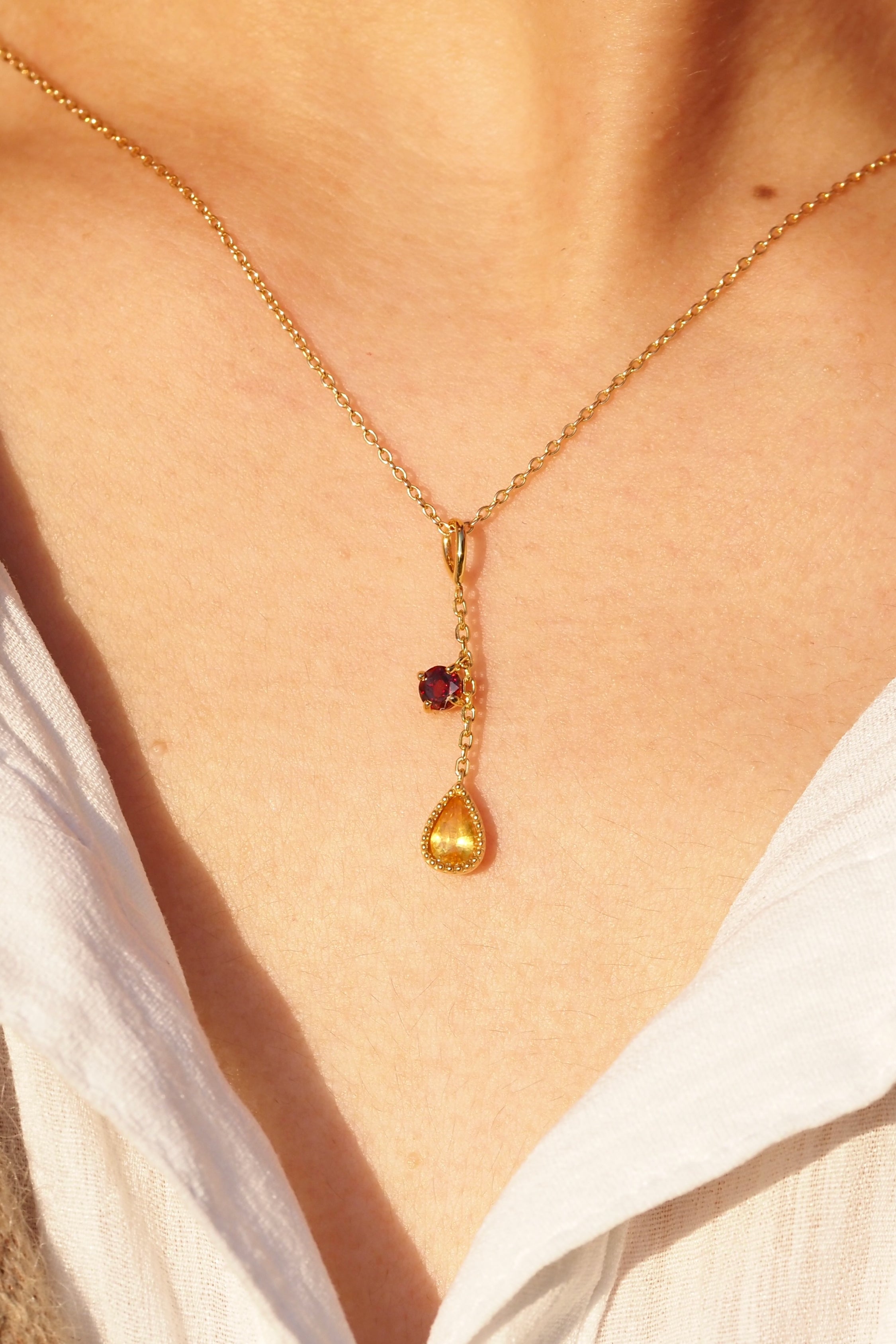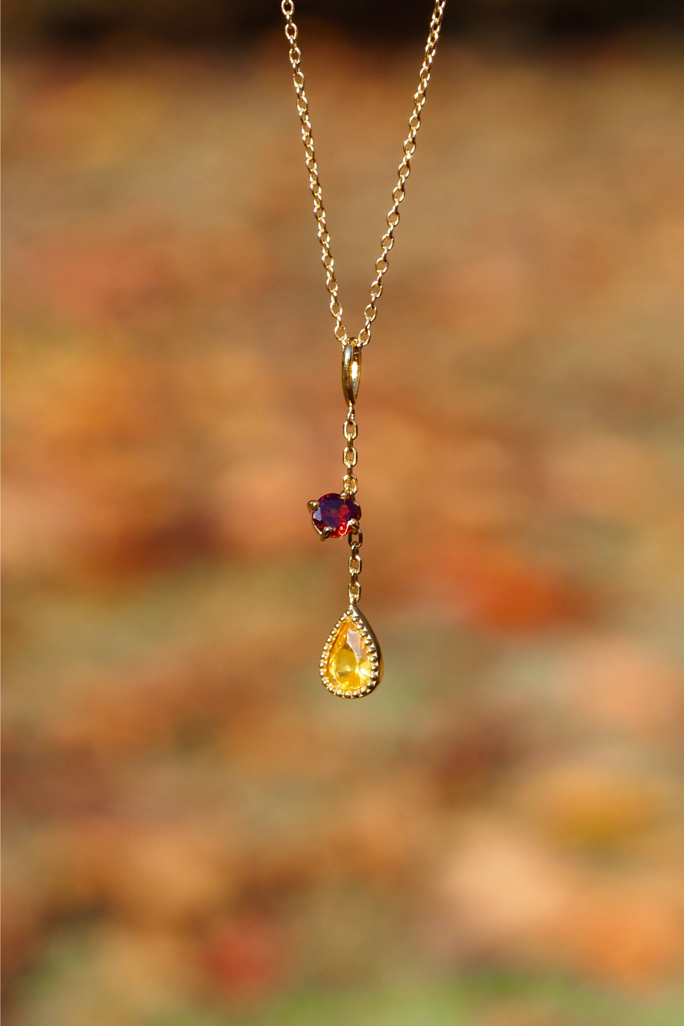 スリランカ産ゴールデンイエローサファイアの透明感あふれる輝きと、レッドスピネルの鮮烈な赤が重なり合い、首元に太陽のような温もりを灯します。