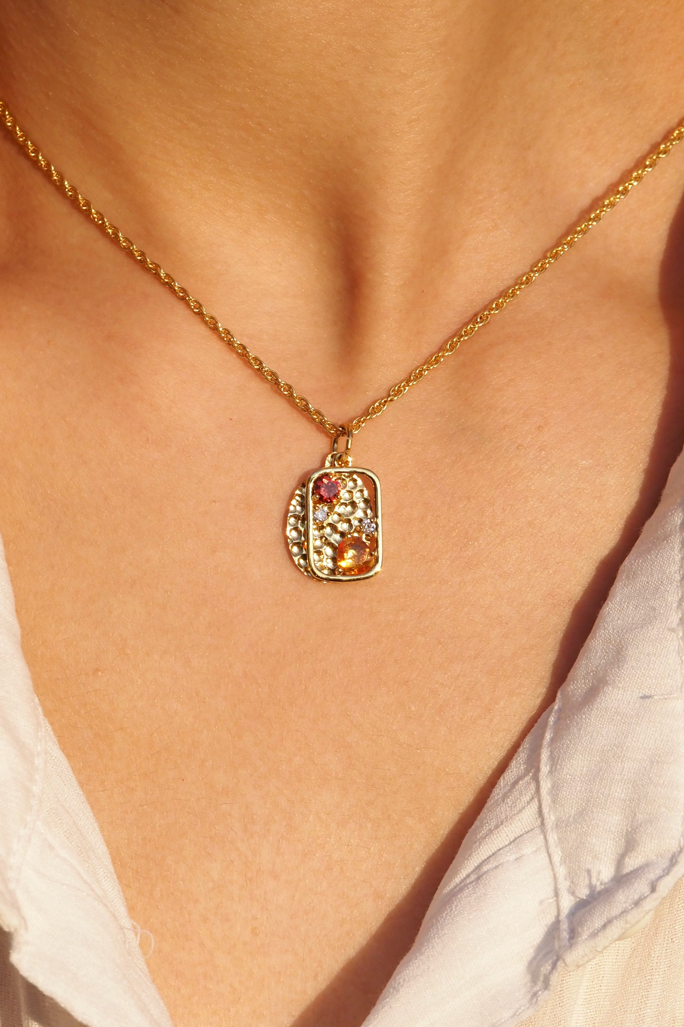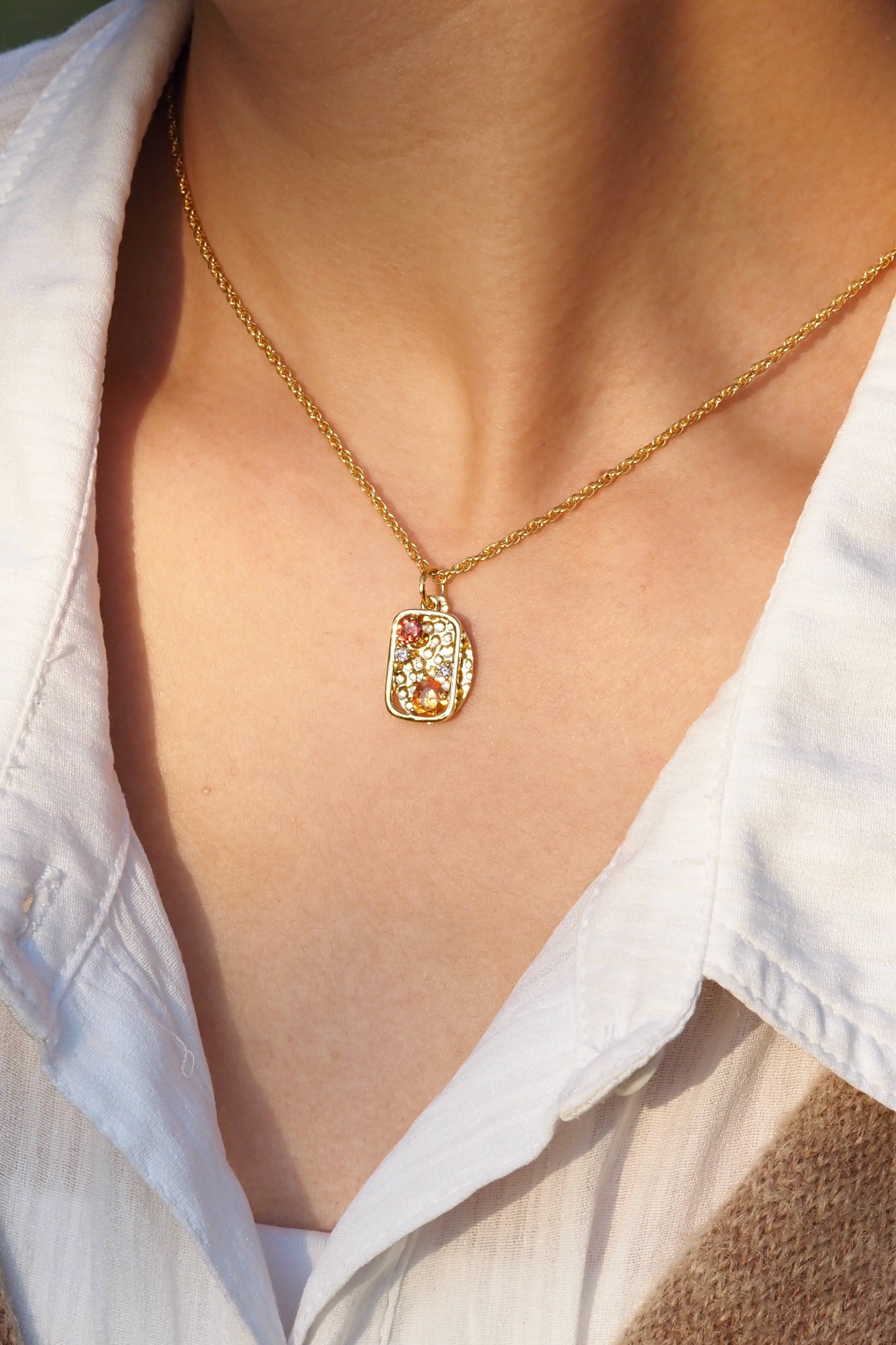 温度を感じるゴールデンオレンジ。朝焼けの光のように胸元を照らす。