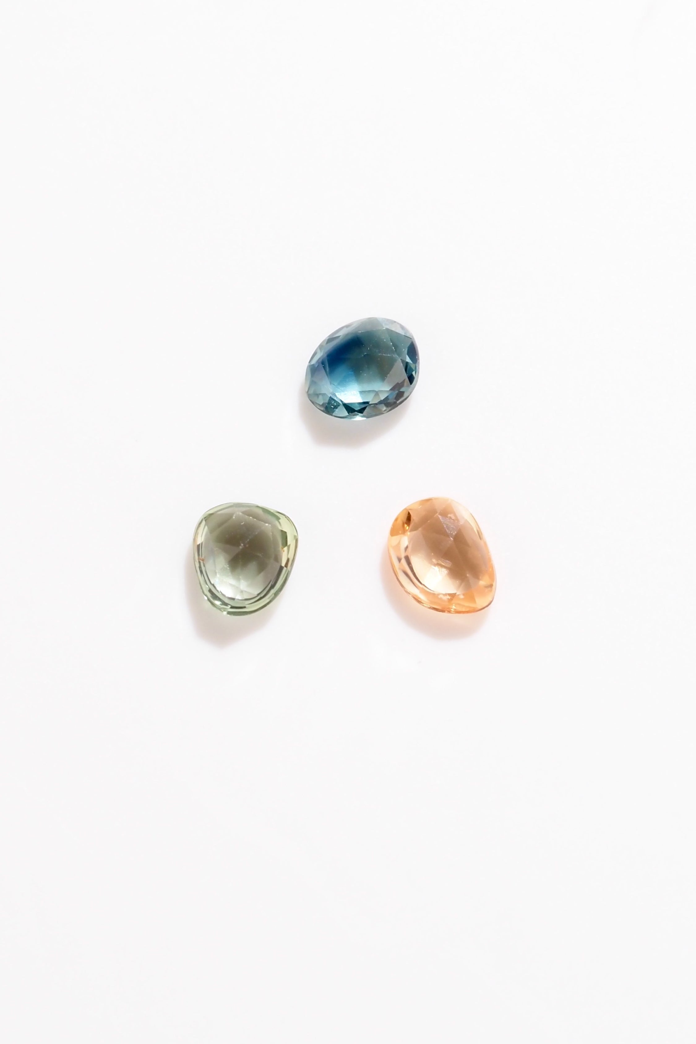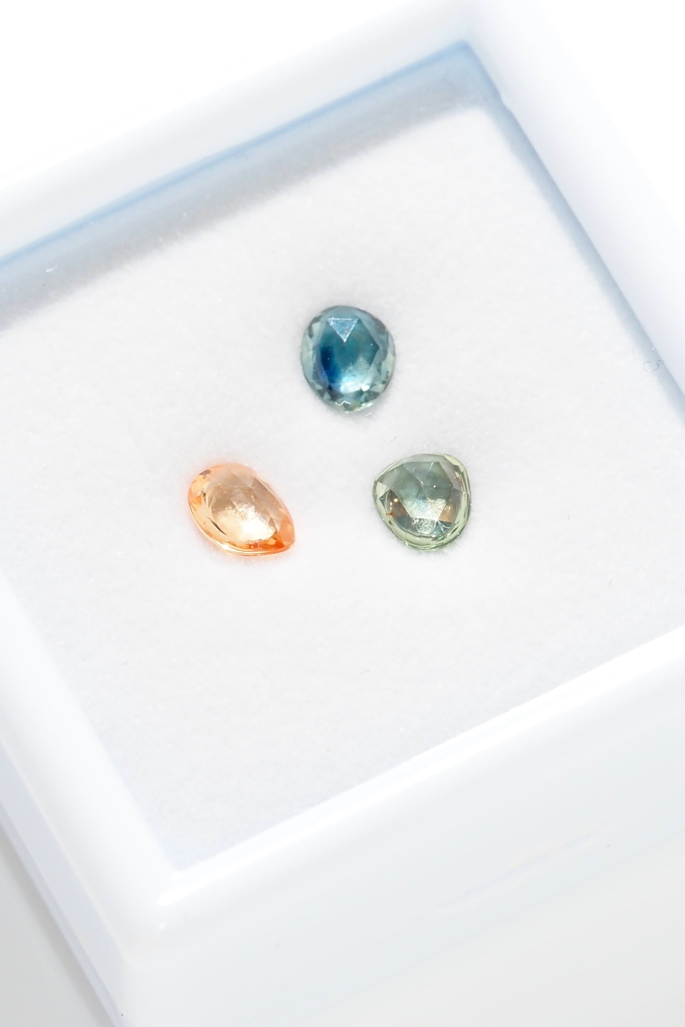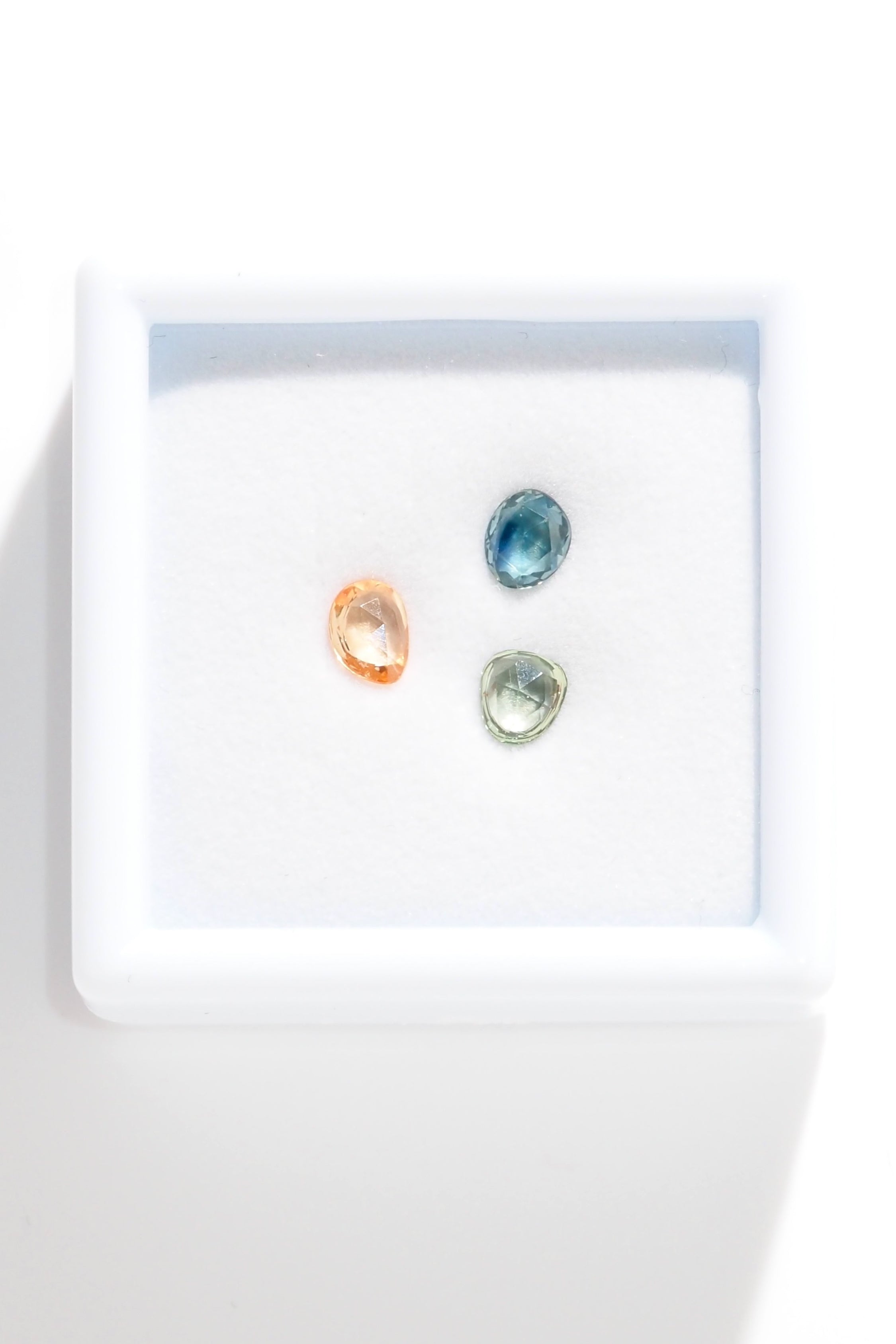 スリランカ産のマルチカラーサファイア3石を、アンティークな魅力あふれるローズカットで仕立てた特別なセットです。