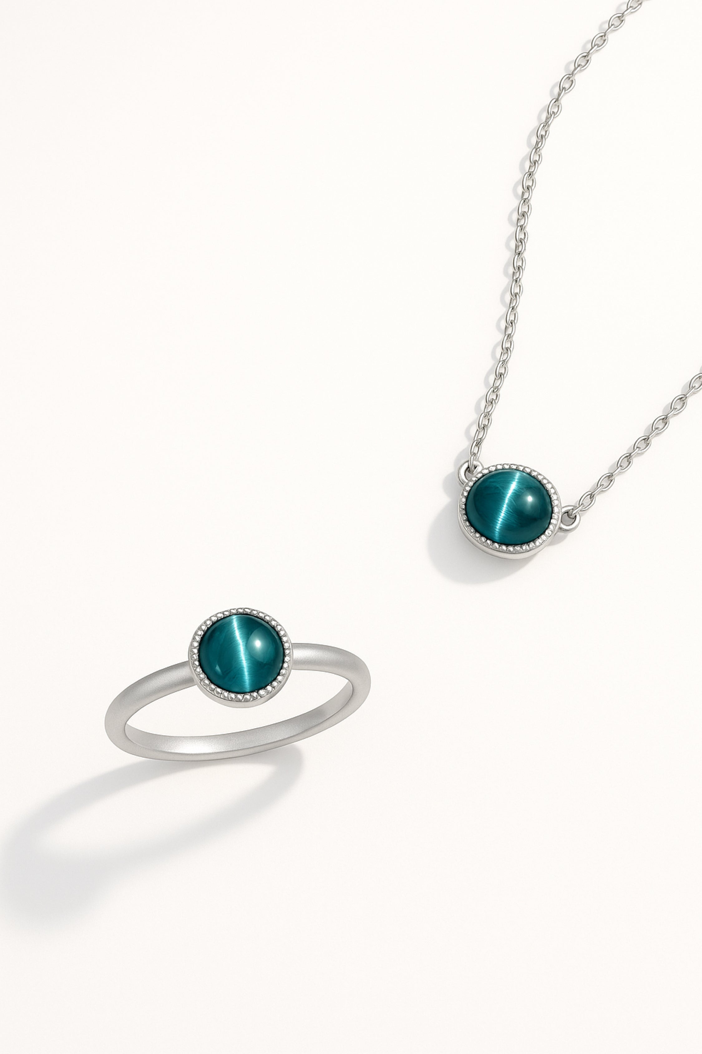 ・胸元に一石だけを飾るペンダント。光が差すたびにキャッツアイが浮かび上がり、視線を惹きつけます。